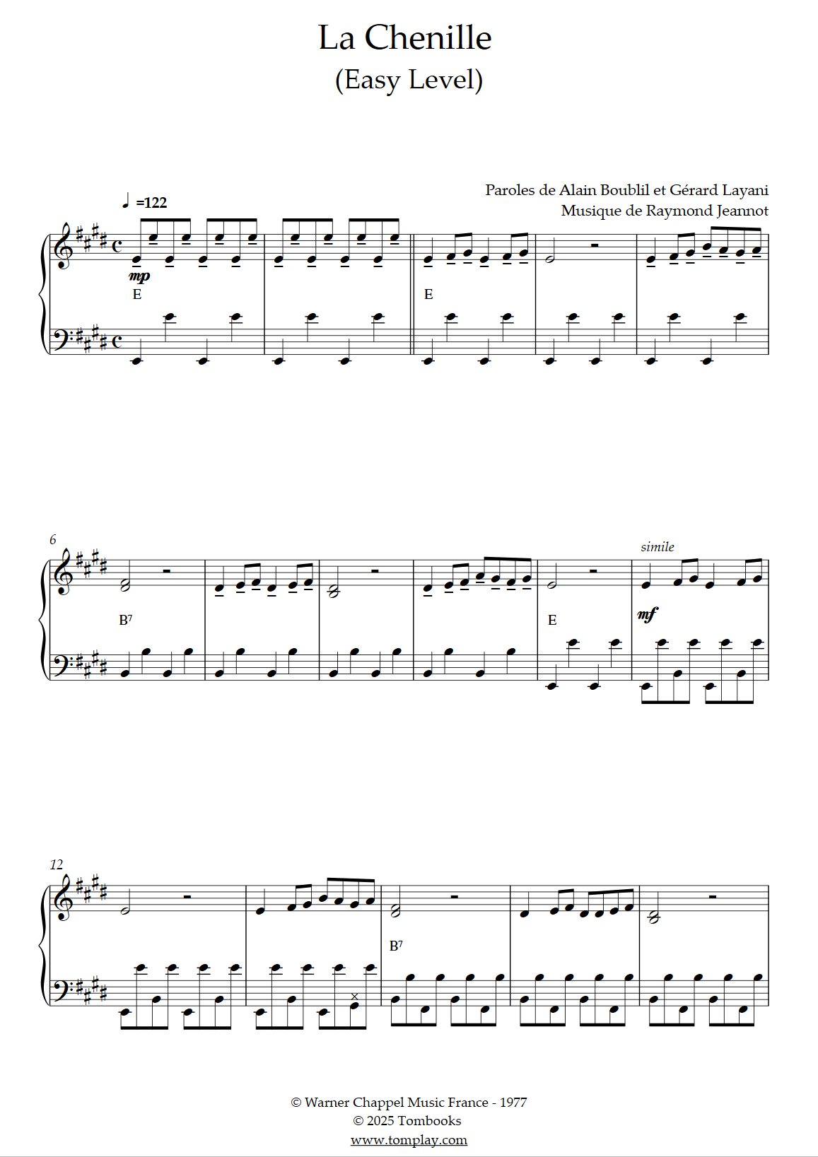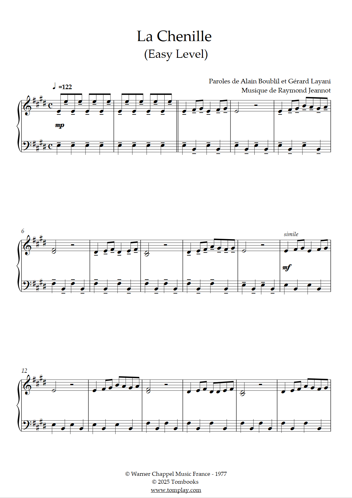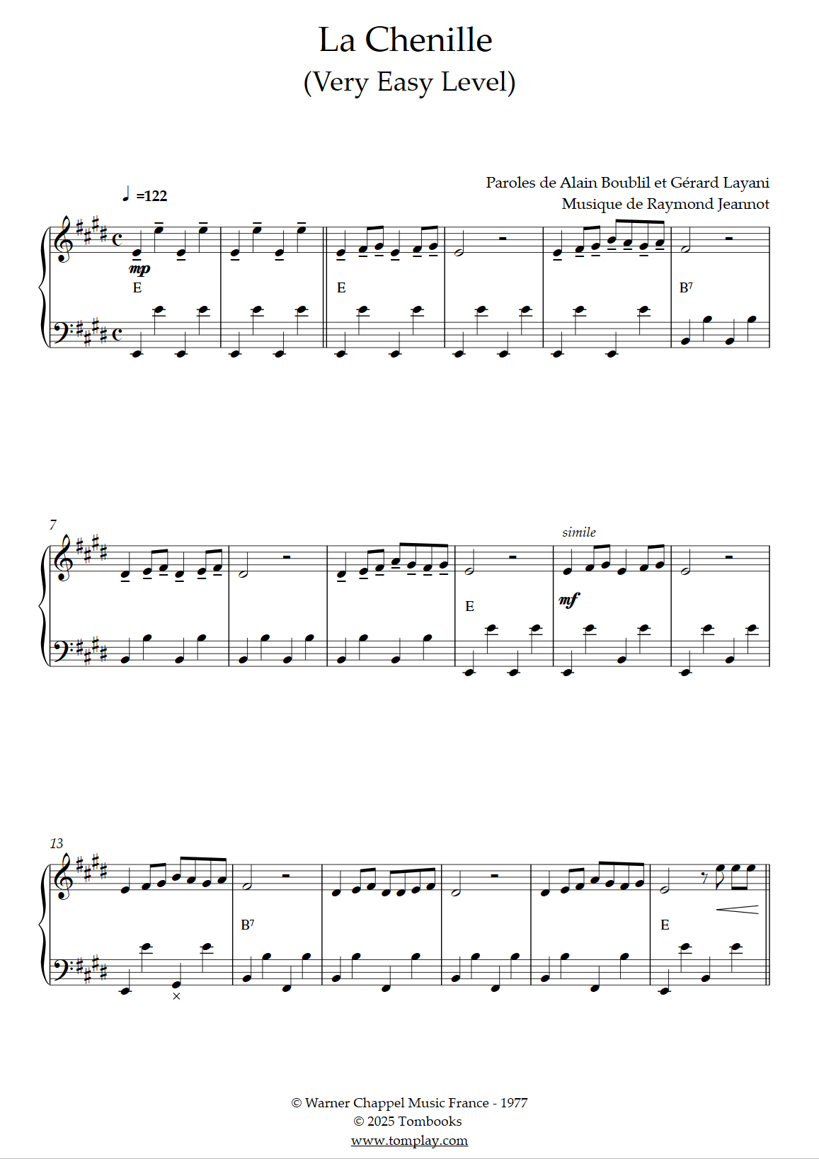 Téléchargez la partition Accordéon La Chenille (niveau très facile, accordéon solo) de Ray…