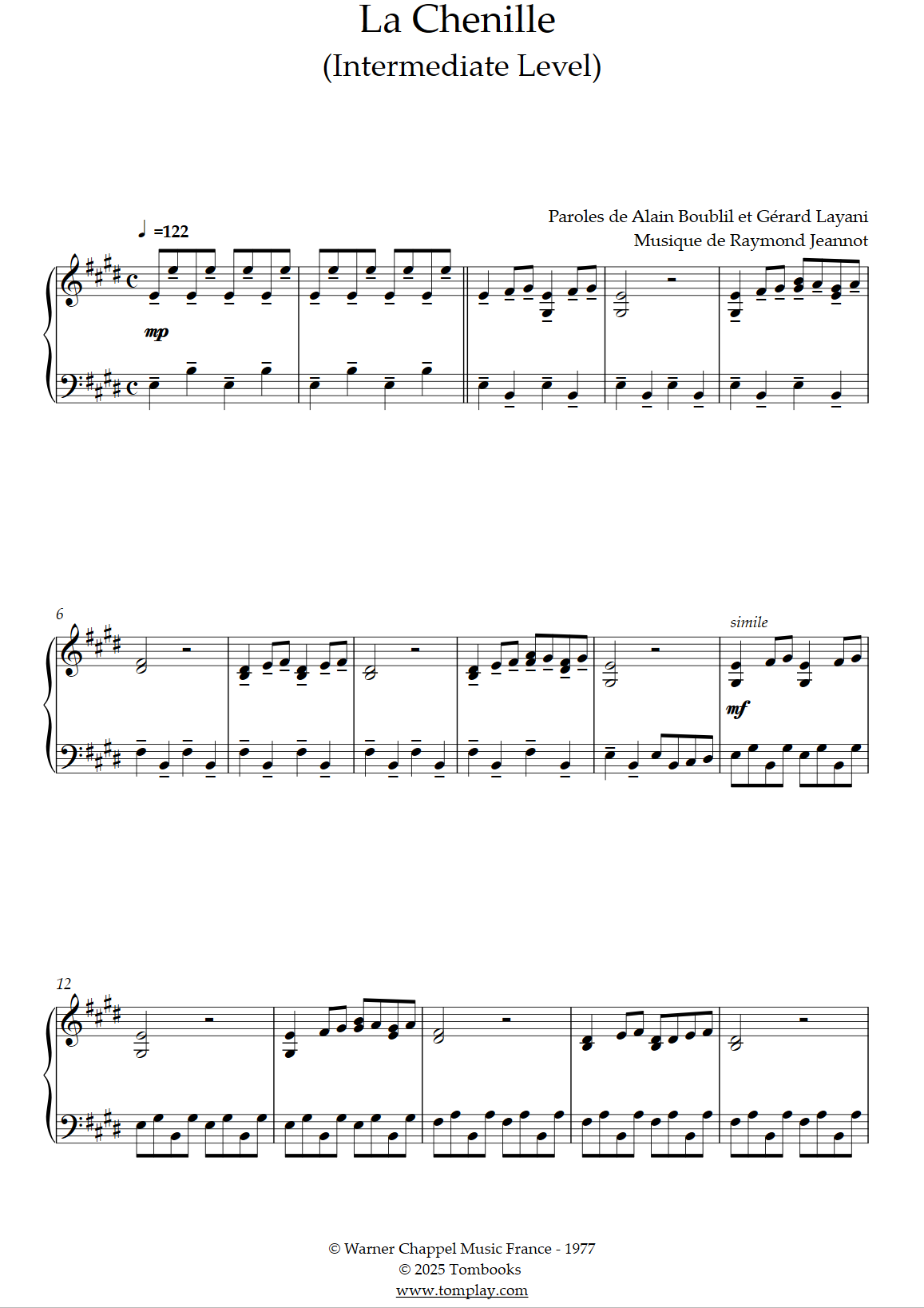 Téléchargez la partition Accordéon La Chenille (niveau intermédiaire, accordéon solo) de R…