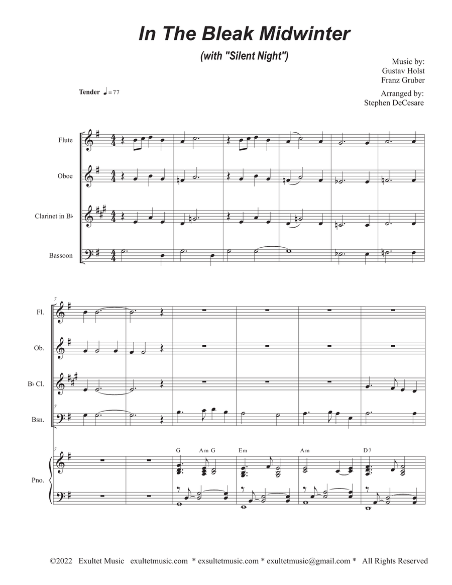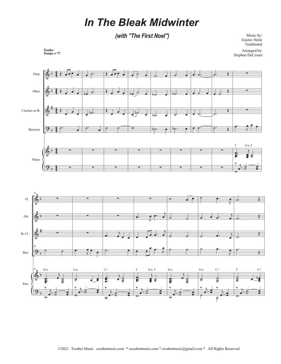 Woodwind Ensemble,Woodwind Quartet Bassoon,Clarinet,Flute,Oboe - Level 3 - Digital Download SKU: A0.523734 Composed by Gustav Holst and Christina Rossetti. Arranged by John A. Dempsey. Celtic,Christian,Christmas,Holiday,Irish,Sacred. 18 pages. John A. Dempsey #3865023. Published by John A. Dempsey (A0.523734). A wintry landscape, a miracle, a wondrous season: all these are evoked in this traditional English Christmas carol that's also popular among Celtic music fans.  Arranged as a woodwind quartet for flute, oboe, Bb clarinet and bassoon, this snowy, atmospheric music is recommended for Christmas plays, pageants and programs, holiday recitals and Christmas concerts as well as traditional Christmas church services and other seasonal worship events, as a prelude, postlude, an offertory, interlude, Christmas play overture, special music and silent prayer accompaniment.  Concert Key: F major.  14 pages of music (that includes the score and separate two-page parts for each instrument)   What can I give Him, poor as I am?   If I were a shepherd, I would give a lamb.   If I were a wise man, I would do my part   But what can I give Him?  Give Him my heart.