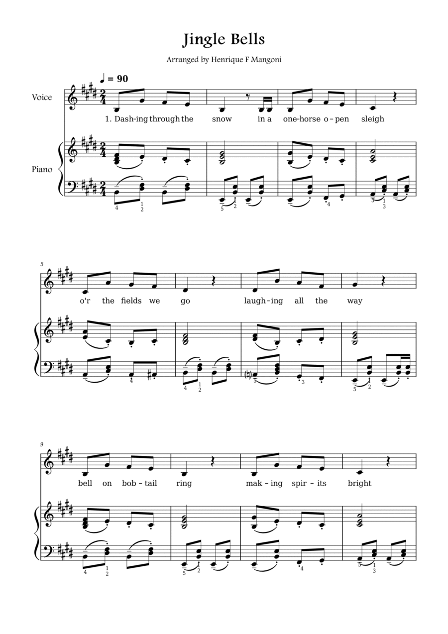 Piano,Vocal,Voice - Level 1 - Digital Download SKU: A0.1113753 Composed by James Lord Pierpont. Arranged by Henrique F Mangoni. Children,Christmas,Holiday,Traditional. Score. 3 pages. Henrique Franke Mangoni #715648. Published by Henrique Franke Mangoni (A0.1113753). Jingle Bells arranged for solo voice and piano accompaniment. Easy/Beginner level arrangement for piano and voice on the key of E major. Learn how to sing this traditional christmas tune! Perfect for children, students, preschoolers, beginners, singing teachers and music teachers. This edition includes the chords of the song and the piano fingering. Subscribe to my YouTube channel to know more about my work! jingle bells easy sheet music, jingle bells voice sheet music, jingle bells melody sheet music, jingle bells piano sheet music, jingle bells solo piano sheet music, jingle bells piano chords, jingle bells piano fingering, how to play jingle bells on the piano, jingle bells piano sheet music, christmas music for piano, christmas songs for piano, christmas tunes for piano.