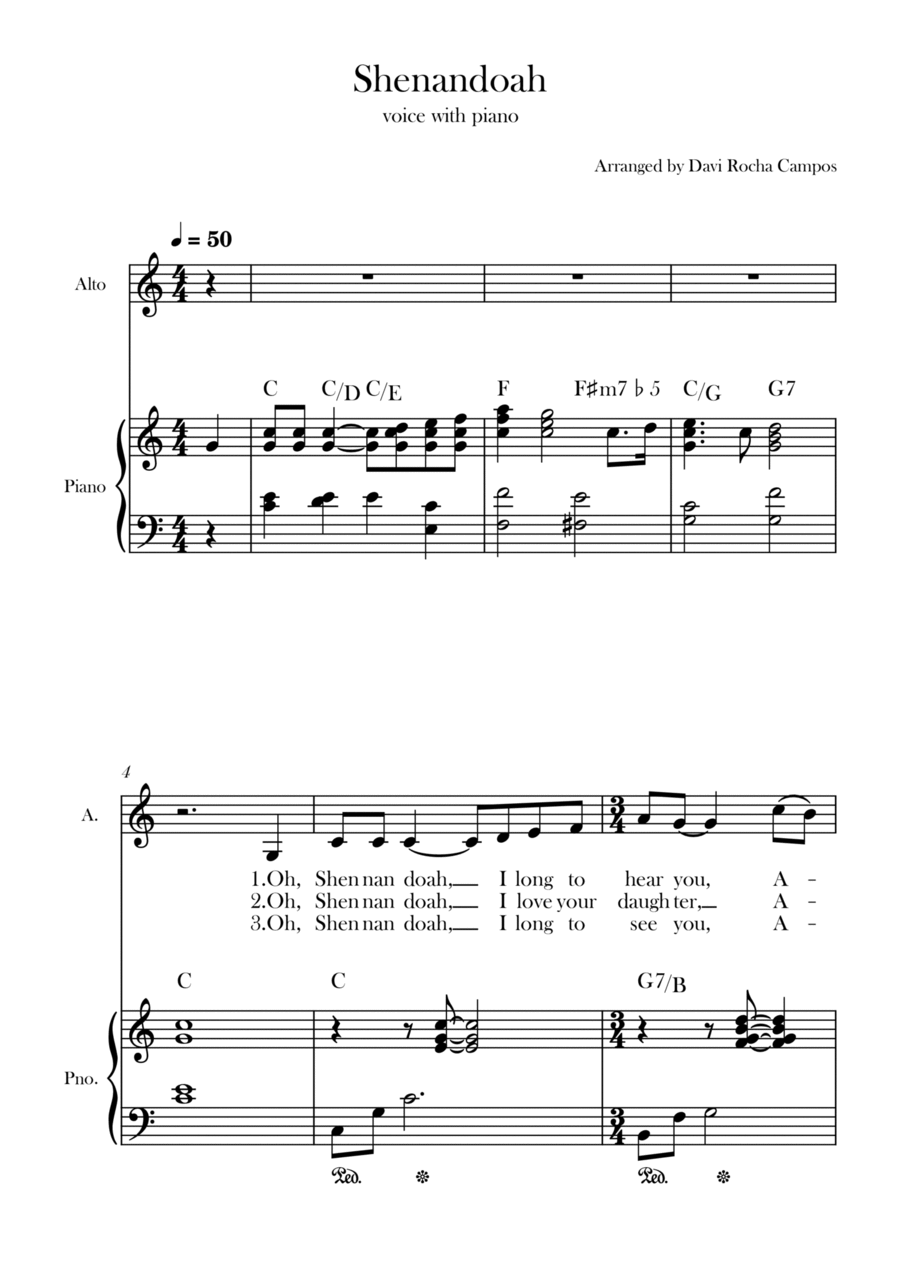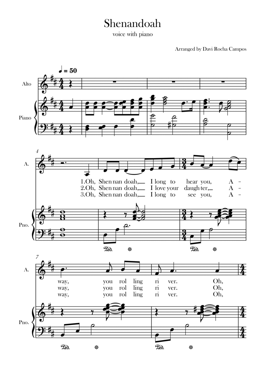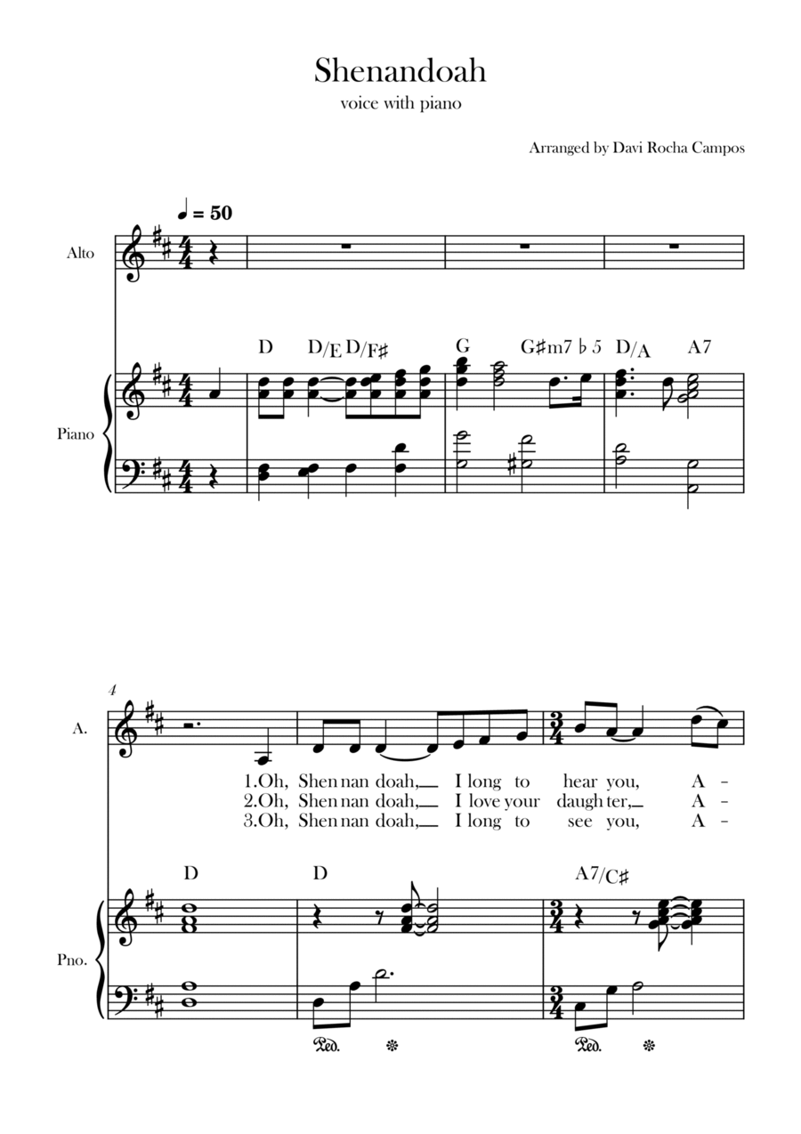 Piano,Vocal,Voice - Level 2 - Digital Download SKU: A0.1233971 By Davi Rocha Campos. By Anonymous 19th century. Arranged by Davi Rocha Campos. 19th Century,Chamber,Folk,Multicultural,Traditional,World. Score. 3 pages. Davi Rocha Campos #829530. Published by Davi Rocha Campos (A0.1233971). A nice arrangement for the song Shenandoah for alto with piano.