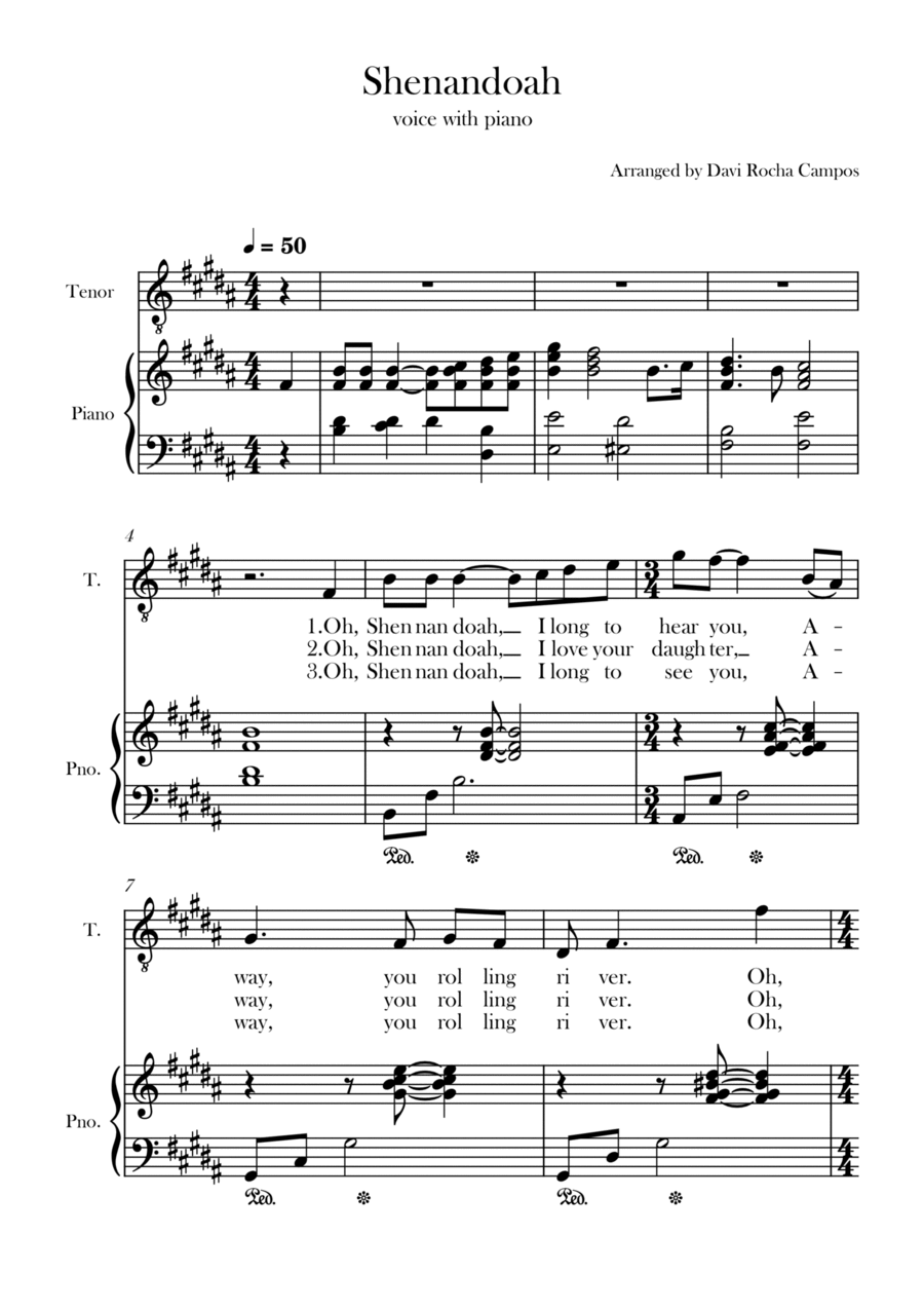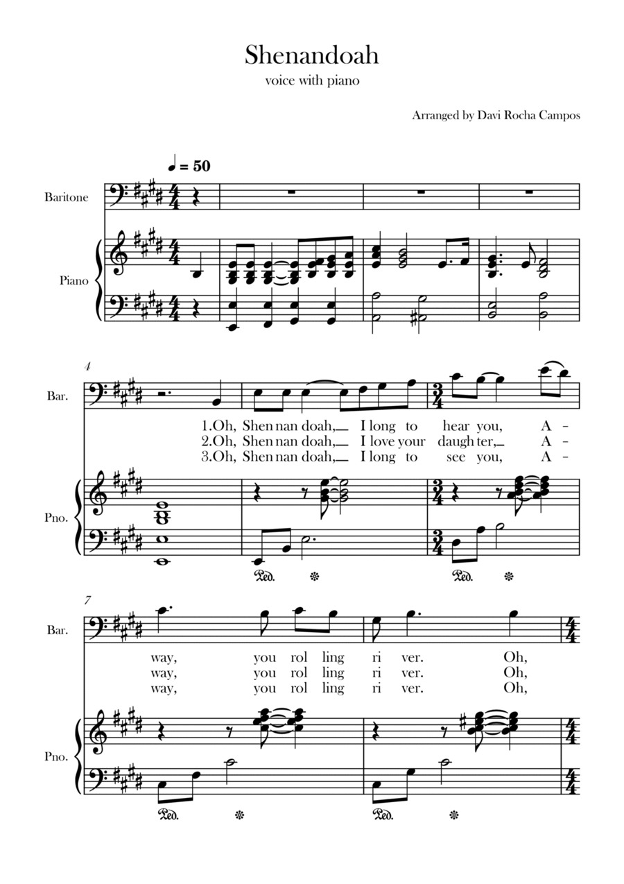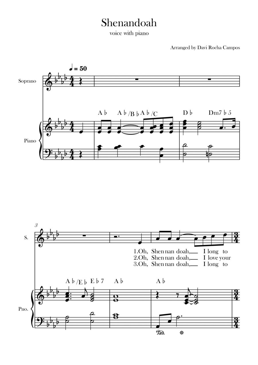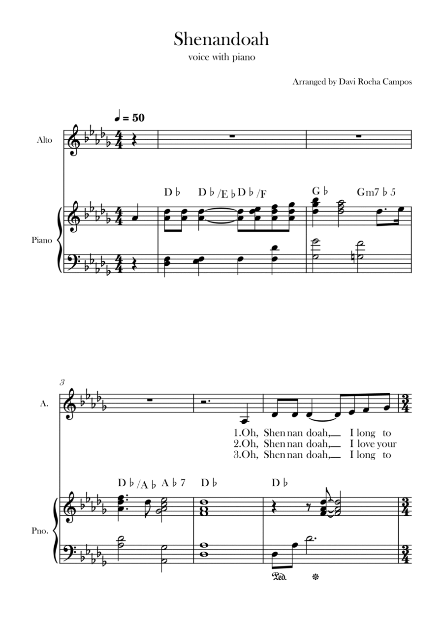 Piano,Vocal,Voice - Level 2 - Digital Download SKU: A0.1233971 By Davi Rocha Campos. By Anonymous 19th century. Arranged by Davi Rocha Campos. 19th Century,Chamber,Folk,Multicultural,Traditional,World. Score. 3 pages. Davi Rocha Campos #829530. Published by Davi Rocha Campos (A0.1233971). A nice arrangement for the song Shenandoah for alto with piano.