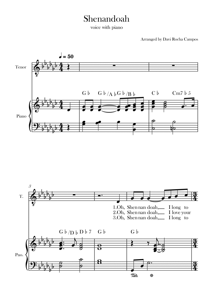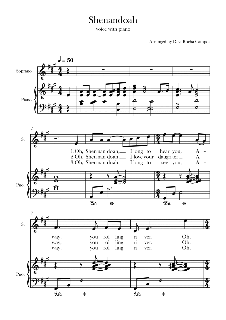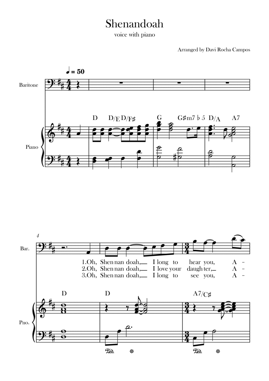 Piano,Vocal,Voice - Level 2 - Digital Download SKU: A0.1234086 By Davi Rocha Campos. By Anonymous 19th century. Arranged by Davi Rocha Campos. 19th Century,Chamber,Folk,Multicultural,Traditional,World. Score. 2 pages. Davi Rocha Campos #829623. Published by Davi Rocha Campos (A0.1234086). A nice arrangement for the song Shenandoah for baritone with piano.
