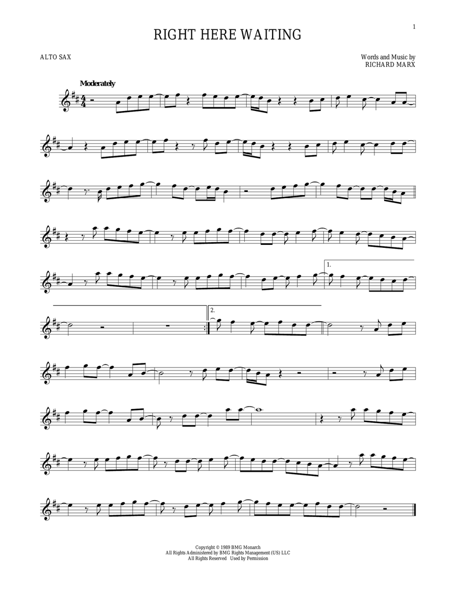 Richard Marx: Right Here Waiting sheet music to print instantly for alto saxophone solo