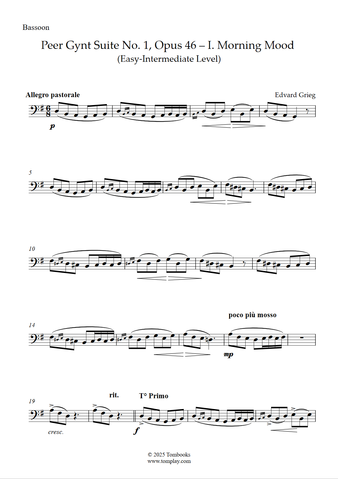 Bassoon Solo - Level 2 - Digital Download SKU: A0.1412591 Composed by Edvard Grieg. Arranged by Glauco Fernandes. Chamber,Classical,Instructional,Romantic Period,Wedding. Individual part. 2 pages. Glauco Fernandes #994609. Published by Glauco Fernandes (A0.1412591). Dive into the serenity of dawn with our exclusive arrangement of Edvard Grieg's Morning Mood from the Peer Gynt Suite. This carefully crafted arrangement is perfect for musicians looking to not only enrich their repertoire but also capture the tranquil and inspiring essence of Grieg's famous melody.For educators and music teachers, this score becomes a valuable pedagogical resource, allowing students to explore the nuances of Romantic composition and develop a deep appreciation for the ability to evoke images and emotions through music. Introducing Morning Mood into lessons can offer a window into the vast world of program music, encouraging a more intimate and expressive connection with musical performance.This arrangement is equally valuable for professional musicians, providing a refined and expressive piece for concerts, special events, and even moments of personal reflection. The universality and timeless beauty of Morning Mood make it a desirable addition to any musician's repertoire, standing out in occasions ranging from formal recitals to more intimate ceremonies.Our arrangement of Morning Mood promises to be a rewarding addition for students seeking musical growth as well as for professionals wishing to enchant their audience with the tranquil beauty of dawn. Maintaining the essence and charm of Grieg's original composition, this arrangement invites everyone to experience the magic of one of the most emblematic moments in classical music.Tags: Edvard Grieg, Peer Gynt, Morning Mood, Romantic music, music education, arrangement, repertoire for events, classical music, sheet music, musical growth, expressive performance.