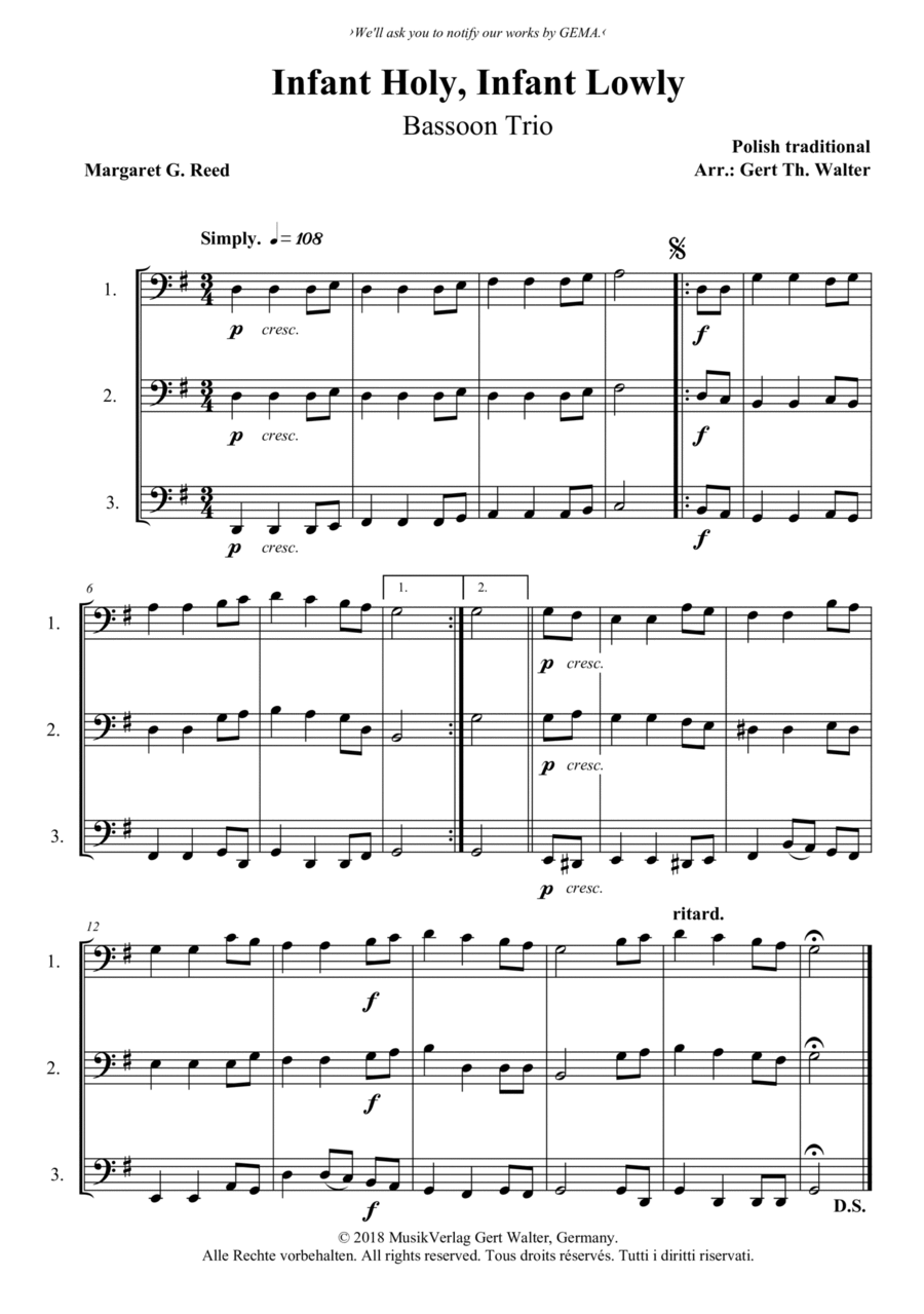 Woodwind Ensemble,Woodwind Trio Bassoon - Level 3 - Digital Download SKU: A0.968027 Composed by Lawrence H. Underwood. Concert,Contemporary,Instructional,Standards. 8 pages. Lawrence H Underwood #6254525. Published by Lawrence H Underwood (A0.968027). All the pieces in the Mix & Match Ensemble Series were written so that not only like instruments may perform together, but virtually any combination of dissimilar instruments can join together successfully in chamber groups. All of these original compositions are of sufficient length to meet the requirements of solo & ensemble contests and festivals.Each piece in the series has been arranged for and can be performed by any combination of flute, oboe, bassoon, clarinet, bass clarinet, alto saxophone, tenor saxophone, baritone saxophone, French horn, trumpet (baritone - treble clef), trombone, euphonium/baritone - bass clef, tuba, mallet percussion, violin, viola, cello, and bass.