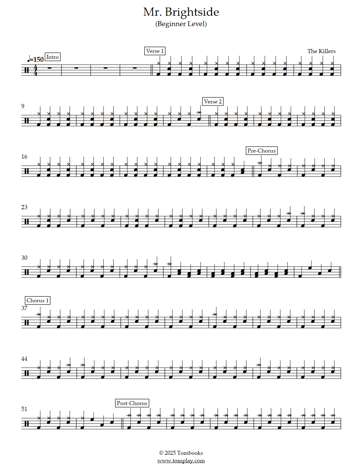 Drums - Level 3 - Digital Download SKU: A0.1309198 By The Killers. By Brandon Flowers, Dave Keuning, Mark Stoermer, and Ronnie Vannucci. Arranged by Jon Kubis. Pop,Punk,Rock. Score. 5 pages. Hollywood Charts #898373. Published by Hollywood Charts (A0.1309198). Delve deep into the iconic groove of The Killers' anthemic hit, Mr. Brightside. This meticulously transcribed drum sheet music captures the essence and energy that underpins one of the defining tracks of the 21st century. Recognized worldwide for its catchy melodies and unforgettable hooks, this song has been a staple on playlists, radio stations, and stages across the globe.Unleash the rhythm and pulse of Mr. Brightside on drums, and immerse yourself in one of the most influential sounds in modern rock. Grab your copy today and step into the spotlight as the backbone of this timeless track!
