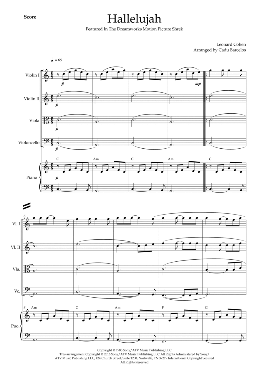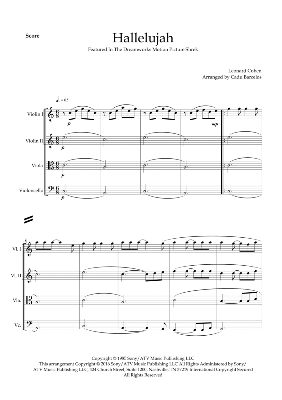 String Quartet Cello,String Quartet,Viola,Violin - Level 2 - Digital Download SKU: A0.1438103 By Andrea Bocelli. By Leonard Cohen. Arranged by Glauco Fernandes. Chamber,Film/TV,Instructional,Pop,Wedding. 6 pages. Glauco Fernandes #1018155. Published by Glauco Fernandes (A0.1438103). Are you looking for a sheet music arrangement that combines ease of play with professional quality? Presenting our simplified arrangement of Hallelujah, the iconic song by Leonard Cohen, also featured in the Shrek movie soundtrack. This arrangement is perfect for students seeking a satisfying and challenging repertoire, as well as an excellent teaching tool for educators.Our arrangement is ideal for musicians of all levels, including professionals who need practicality and quality in their performances. Whether for events, concerts, or weddings, this arrangement offers the perfect blend of simplicity and sophistication, allowing you to perform this beautiful song with mastery and emotion.Get your sheet music now and take your musical performances to a new level. Secure a material that combines accessibility and excellence, meeting the needs of demanding musicians committed to quality.Tags: sheet music, simplified arrangement, Hallelujah, Leonard Cohen, soundtrack, Shrek, music students, music teachers, professional musicians, events, weddings, musical repertoire, teaching material, professional quality, practicality.