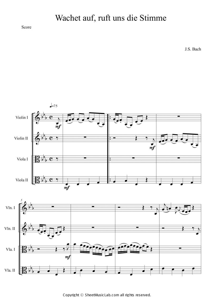 Small Ensemble - Level 5 - Digital Download SKU: A0.621471 By Daniel Kelley. By Johann Sebastian Bach. Arranged by Daniel Kelley. Baroque,Sacred,Spiritual,Traditional,Wedding. Score and parts. 32 pages. Last Resort Music Publishing #230612. Published by Last Resort Music Publishing (A0.621471). WACHET AUF Chorale from Cantata 140 by J. S. Bach 11 Parts plus Score This church cantata by Johann Sebastian Bach is one of his most mature and popular sacred works. Also known as Sleepers Wake, it has also been described as a cantata without weaknesses, without a dull bar, technically, emotionally and spiritually of the highest order, its sheer perfection and its boundless imagination rouse one's wonder time and time again. An amazing resource for any musician, Music for Four is perfect for String Quartet, Mixed Quartet, Three Violins & Cello, Piano Quartet & More! Comes with score and interchangeable parts - the keyboard/guitar part encompasses parts 2, 3 and 4. Therefore, the arrangements could be played as a piano quartet, or an entire quartet could play with a pianist - as long as Part 1 is being played. Set of 11 Parts plus Score Part 1 Flute or Oboe or Violin Part 1 Clarinet in Bb Part 2 Flute or Oboe or Violin Part 2 Clarinet in Bb Part 3 Viola Part 3 Violin Part 3 Clarinet in Bb Part 3 English Horn or French Horn in F Part 4 Cello or Bassoon Part 4 Bass Clarinet in Bb Keyboard or Guitar Score (Parts 1-4 in C) Don't miss our other arrangements - available on SheetMusicPlus and www.lastresortmusic.com String Quartet, Mixed Quartet, Wind Quartet, Clarinet Quartet, 3 Violins and Cello, String Trio or Quartet plus Piano.