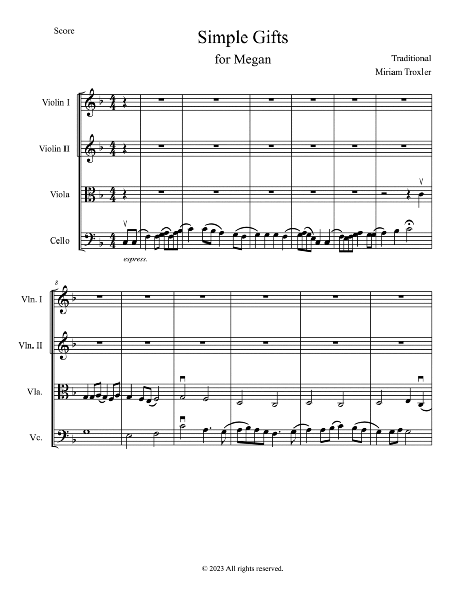 String Quartet Cello,String Quartet,Viola,Violin - Level 3 - Digital Download SKU: A0.1259531 Composed by Traditional. Arranged by Miriam Troxler. Classical,Religious,Standards,Traditional,Wedding. 10 pages. Miriam Troxler #852836. Published by Miriam Troxler (A0.1259531). This arrangement of Simple Gifts is suitable for weddings and performances. It opens with a cello solo. The viola joins for a short duet before the other parts come in. The arrangement builds with the second violin and first violin each playing melody in the second statement of the theme.  The development has the upper strings in a fugue.  The final statement of Simple Gifts is over a quote from Bach's cello suite in G major. Make the cellist and violist in your quartet happy! It will come round right..