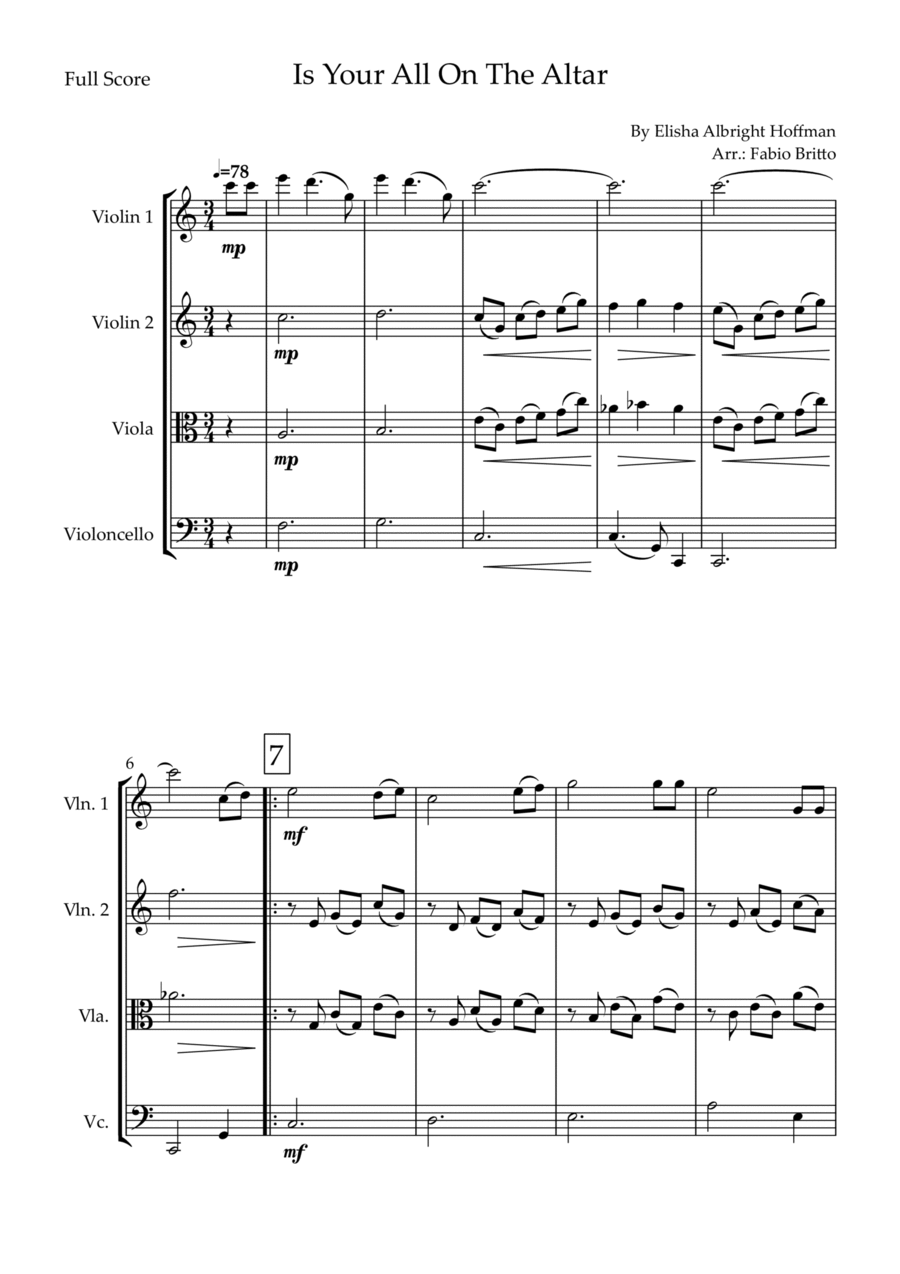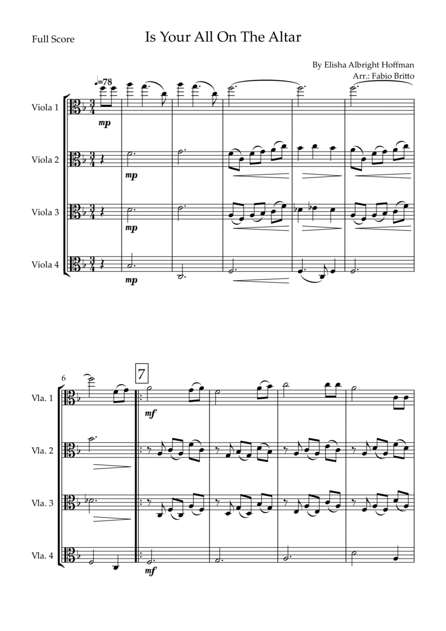 String Quartet String Quartet,Viola - Level 4 - Digital Download SKU: A0.1282730 Composed by Elisha Albright Hoffman. Arranged by Fabio Britto. Christian,Praise & Worship,Religious,Spiritual,Traditional. 8 pages. Fabio Britto #873990. Published by Fabio Britto (A0.1282730). Arrangement of the song Is Your All On The Altar? (Traditional Christian Song) for Viola Quartet.
