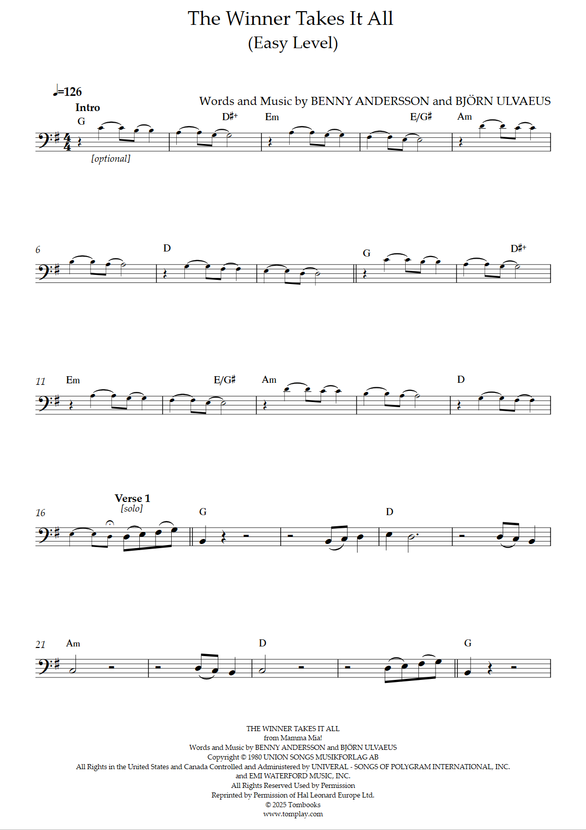 Téléchargez la partition Violoncelle Mamma Mia! - The Winner Takes It All (niveau facile) …