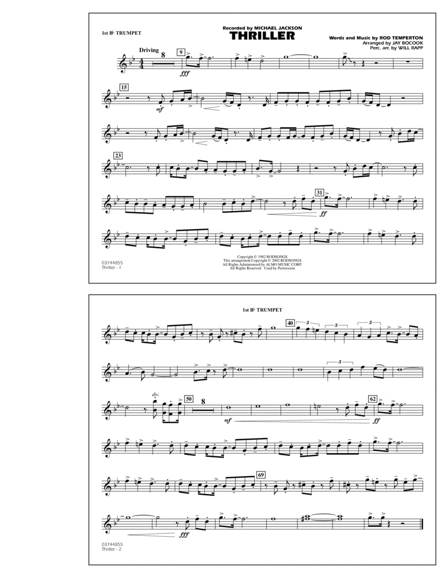 By Michael Jackson. By Rod Temperton. Arranged by Jay Bocook. Concert Band. For Bb Trumpet 2. Pop. Individual instrument part. 1 pages. Duration 2:30. Published by Hal Leonard - Digital Sheet Music