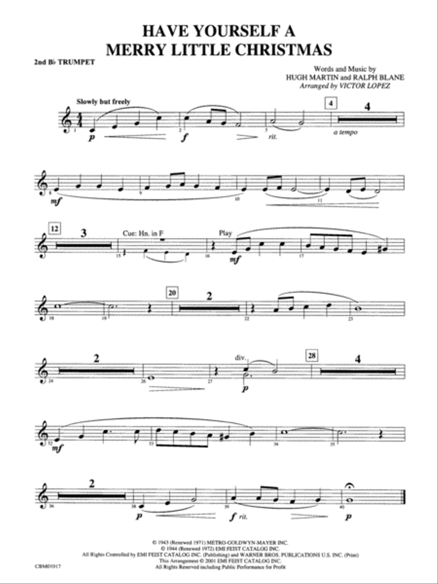 Full Orchestra - Digital Download SKU: AX.00-PC-0015676_T2 2nd B-flat Trumpet. Composed by Haven Gillespie, John Frederick Coots, Kim Gannon, Steve Nelson, and Walter Kent. Instructional. Part. 2 pages. Alfred Music - Digital Sheet Music #00-PC-0015676_T2. Published by Alfred Music - Digital Sheet Music (AX.00-PC-0015676_T2). UPC: 038081302287.Holiday classics come to life in this orchestral version of some of the most familiar and enduring popular songs of the Christmas season. Featuring I'll Be Home for Christmas, Have Yourself a Merry Little Christmas, Santa Claus Is Coming to Town, and Frosty the Snowman. Audiences, young and old, will delight in recapturing the memories of this very special time of year. This title is available in SmartMusic.