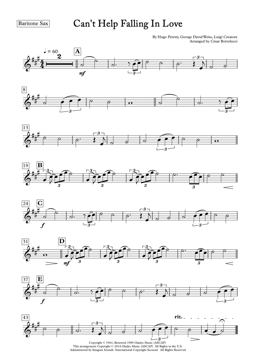 Baritone Saxophone Solo - Level 1 - Digital Download SKU: A0.1116686 By Elvis Presley. By George David Weiss, Hugo Peretti, and Luigi Creatore. Arranged by Rene Alves. Children,Multicultural,Pop,Traditional,Wedding,World. Individual part. 2 pages. Rene Alves #718341. Published by Rene Alves (A0.1116686). Sheet music and melody of the song can't help falling in love for baritone sax for the beginning musician. The sheet music is in large size, great for reading on tablets.