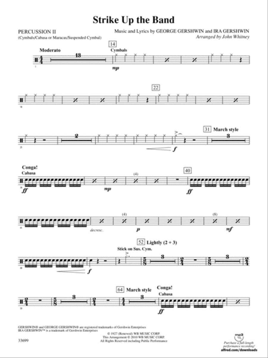 Full Orchestra - Digital Download SKU: AX.00-PC-0016909_PC1 1st Percussion. Composed by George Gershwin. Arranged by Jerry Brubaker. Jazz. Part. 3 pages. Alfred Music - Digital Sheet Music #00-PC-0016909_PC1. Published by Alfred Music - Digital Sheet Music (AX.00-PC-0016909_PC1). UPC: 038081401284.Gershwin's legendary and well-known compositions span both popular and classical genres. Featured works in this beautiful medley include: Strike Up the Band!, I Got Rhythm, Embraceable You, An American in Paris, Prelude II, Summertime, and Rhapsody in Blue. (5:45).