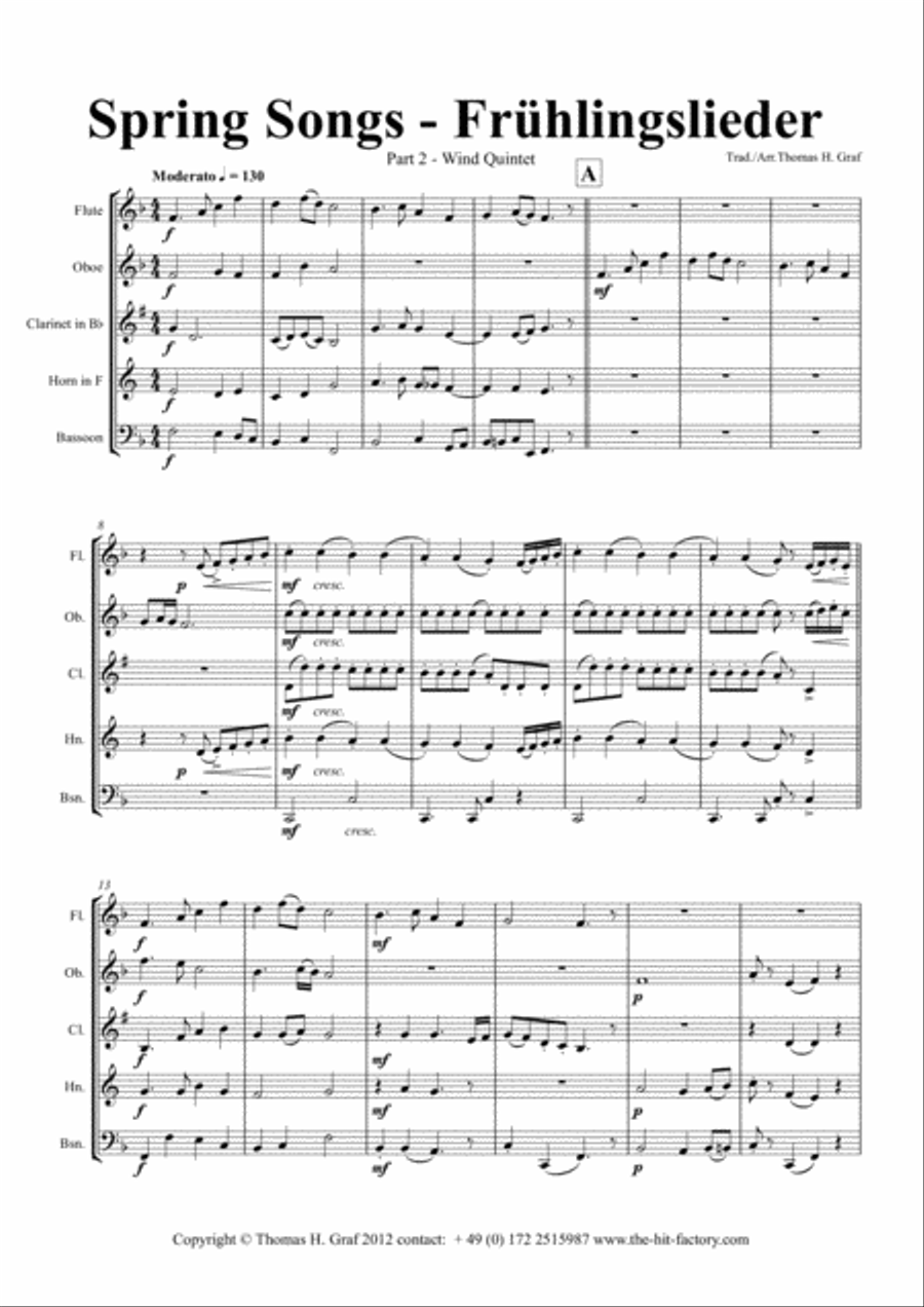 Woodwind Ensemble,Woodwind Quintet - Level 3 - Digital Download SKU: A0.567444 Composed by Thomas H. Graf/trad. Arranged by Thomas Graf. Country,Easter,Folk,World. 14 pages. Thomas Graf - the-hit-factory.com #2009717. Published by Thomas Graf - the-hit-factory.com (A0.567444). Colorful arrangement of one of the most popular and surely one of the most beautiful German folk songs. Ein abwechslungsreiches und farbenfrohes Arrangement dieses wunderschönen deutschen Volksliedes, das perfekt geeignet ist für ein beschwingtes Frühlingskonzert. Instrumentation: Flute, Oboe, Clarinet in Bb, Horn in F, Bassoon Listen to the recording - a challenge for your ensemble. Check out our latest uploads: http://www.sheetmusicplus.com/publishers/thomas-graf-the-hit-factory-com/smp-press/3001412+1303131?N... Any individual arrangement and substitute parts are available on request. Call +49 (0) 172 2515987 E-Mail: info@the-hit-factory.com. www.the-hit-factory.com facebook: https://www.facebook.com/hitfactorymusic Video: https://www.youtu.be/EK03a5eMlKM