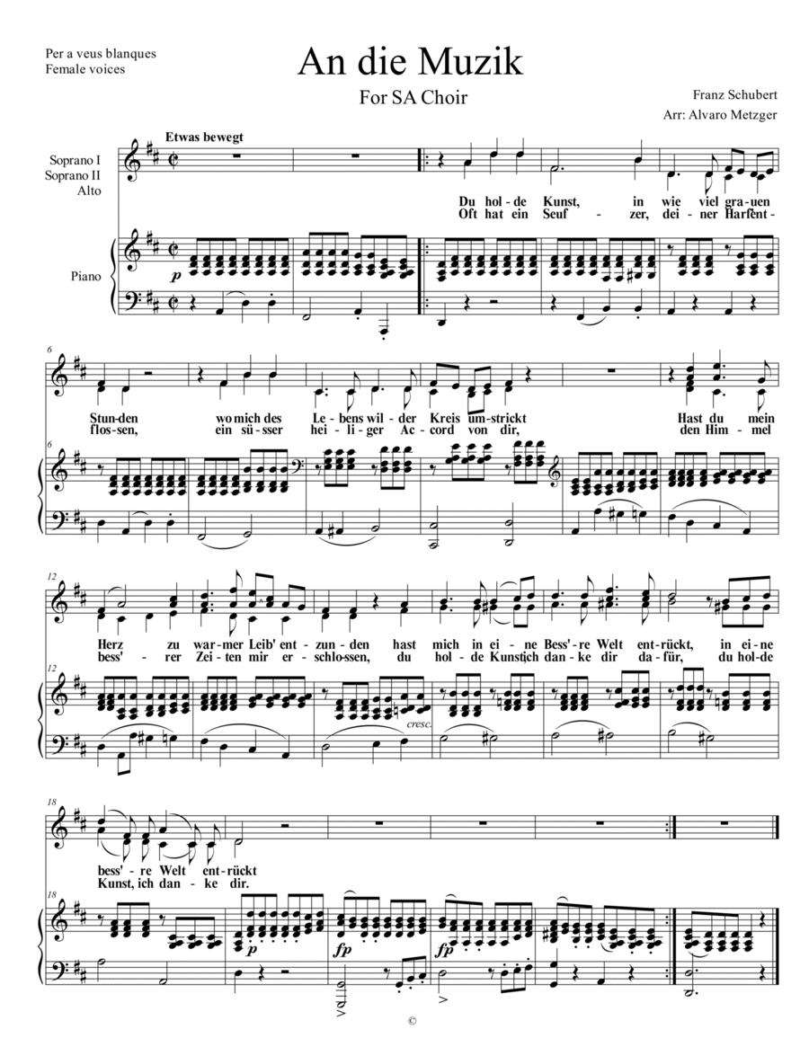 Piano Solo - Level 3 - Digital Download SKU: A0.1272944 By Various. By Franz Shubert. Arranged by Sérgio Matias da Cunha. Instructional,Romantic Period,Soul,Spiritual,Wedding. Score. 2 pages. Sérgio Matias da Cunha #865127. Published by Sérgio Matias da Cunha (A0.1272944). Arranjo claro, objetivo, conciso e acessível apresentando células rítmicas envolvendo quartos de tempo, marcações de cifra, dedilhado e sinais de repetição, procurando a maior fidelidade com a obra original através das notas mais marcantes e características para o melhor efeito com simplicidade e equilíbrio. Acompanhamento baseado em movimento padronizado de sucessivas colcheias sobre as notas dos respectivos acordes em estado fundamental ou invertido. Encontre mais partituras como essa, colando o nome do arranjador (Sérgio Matias da Cunha) na barra de pesquisa. ATENÇÃO: Compre os quatro volumes do “Curso de Teclado Primeiros Toques†no site https://www.sheetmusicplus.com/ colando o código na barra de pesquisa. Volume1 (A0.1314018) Volume2 (A0.1314021) Volume3 (A0.1314023) Volume4 (A0.1314028).