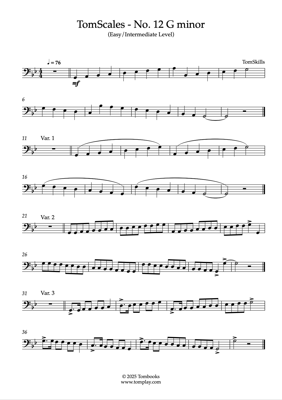 Téléchargez la partition Trombone TomScales - N° 12 Sol mineur (niveau facile/intermédiair…