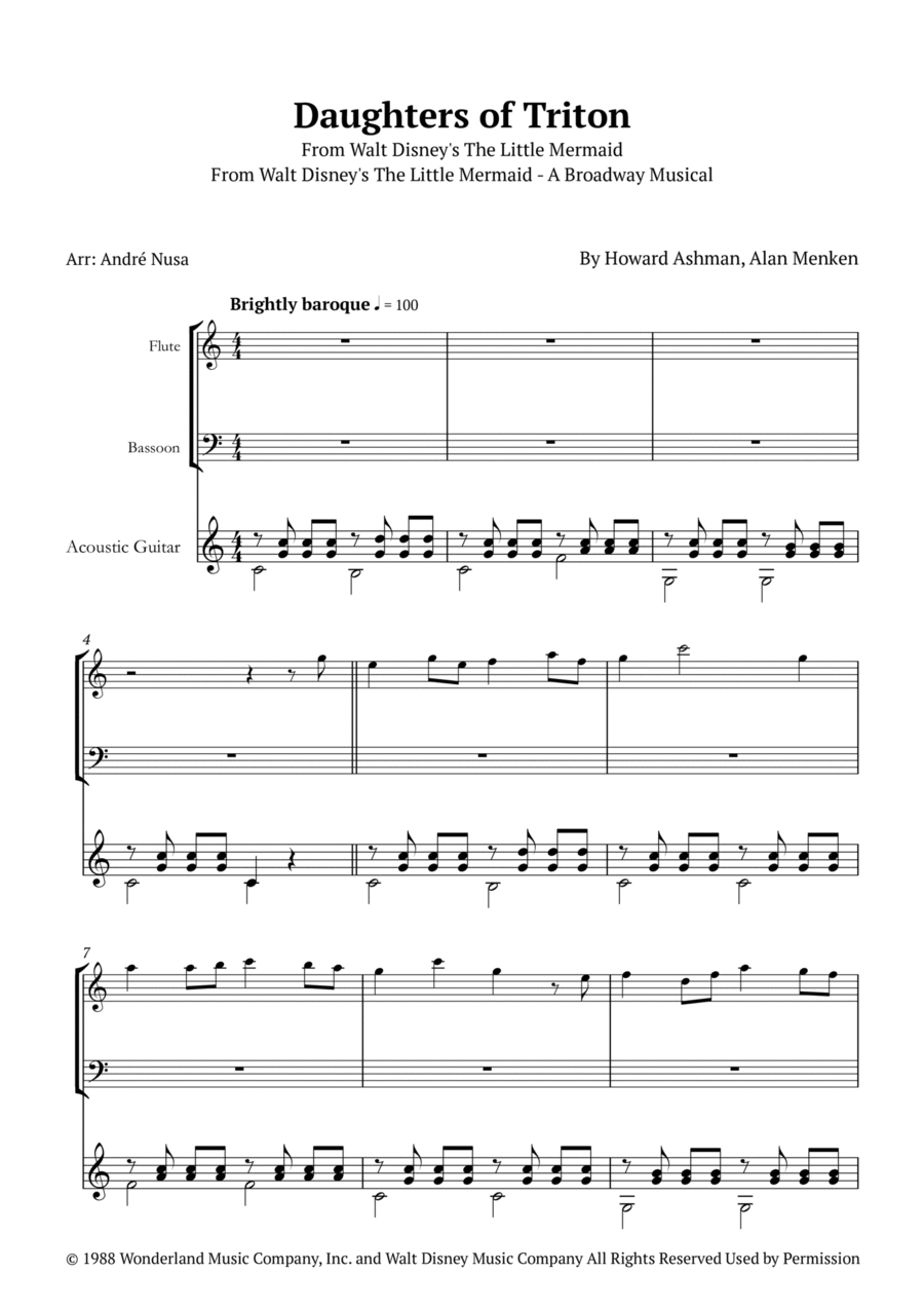 Acoustic Guitar,Bassoon,Flute - Level 1 - Digital Download SKU: A0.1234995 Composed by Alan Menken and Howard Ashman. Arranged by André Nusa. Broadway,Film/TV,Musical/Show. 9 pages. Andre_Nusa #830524. Published by Andre_Nusa (A0.1234995). Experience the enchantment of Daughters of Triton from the beloved Disney film The Little Mermaid with this captivating acoustic guitar, flute and bassoon arrangement. Immerse yourself in the delightful melodies of Ariel's underwater world as you embark on a musical journey filled with charm and grace. The acoustic guitar sets the rhythmic foundation, while the flute and bassoon add a touch of elegance and sweetness, creating a harmonious blend that evokes a sense of wonder and enchantment. The interplay between the instruments creates a captivating and evocative atmosphere, allowing you to relive the magic of this cherished Disney song in a unique and enchanting way. Whether you're performing for an audience or simply enjoying the music in the comfort of your own home, this arrangement is sure to create an enchanting and nostalgic experience. Let the expressive melodies and harmonies of Daughters of Triton bring joy and evoke a sense of childhood wonder.