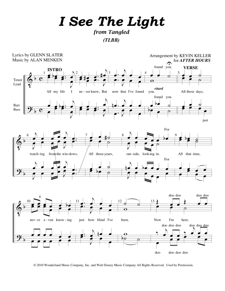 Choral Choir (TTBB) - Level 3 - Digital Download SKU: A0.848002 Composed by Alan Menken and Glenn Slater. Arranged by Kevin Keller. A Cappella,Barbershop,Film/TV. Octavo. 4 pages. Kevin Keller #454702. Published by Kevin Keller (A0.848002). TTBB a cappella barbershop chart (melody in T2) - suitable for contest in BHS - as sung by After Hours with different intro.