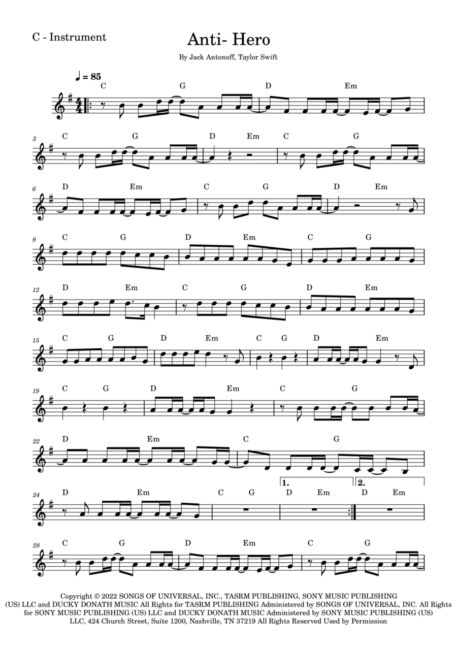 B-Flat Trumpet Solo - Level 1 - Digital Download SKU: A0.1143597 By Taylor Swift. By Jack Antonoff and Taylor Swift. Arranged by Fabio Eduardo de Oliveira. Pop. Individual part. 2 pages. Fabio Eduardo #743915. Published by Fabio Eduardo (A0.1143597). FREE DOWNLOAD PLAYBACKÂ https://www.fabioeduardomusiconline.com/freedownloadAnti-Hero is a song by American singer-songwriter Taylor Swift and the lead single from her tenth studio album, Midnights (2022).