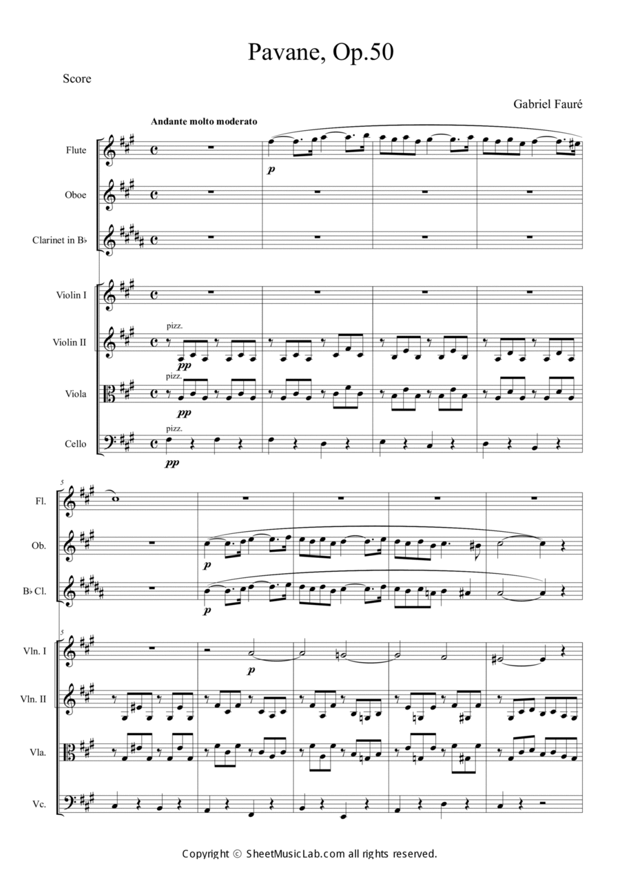 Mixed quintet (Flute, Oboe, Clarinet, Violin, Violin, Viola, Cello) - Primer Level - Digital Download SKU: P5.CL-MOD-32801 Composed by Gabriel Faure. Classical. Score and Parts. 26 pages. SheetmusicLAB #CL-MOD-32801. Published by SheetmusicLAB (P5.CL-MOD-32801). 8.3 x 11.7 inches.