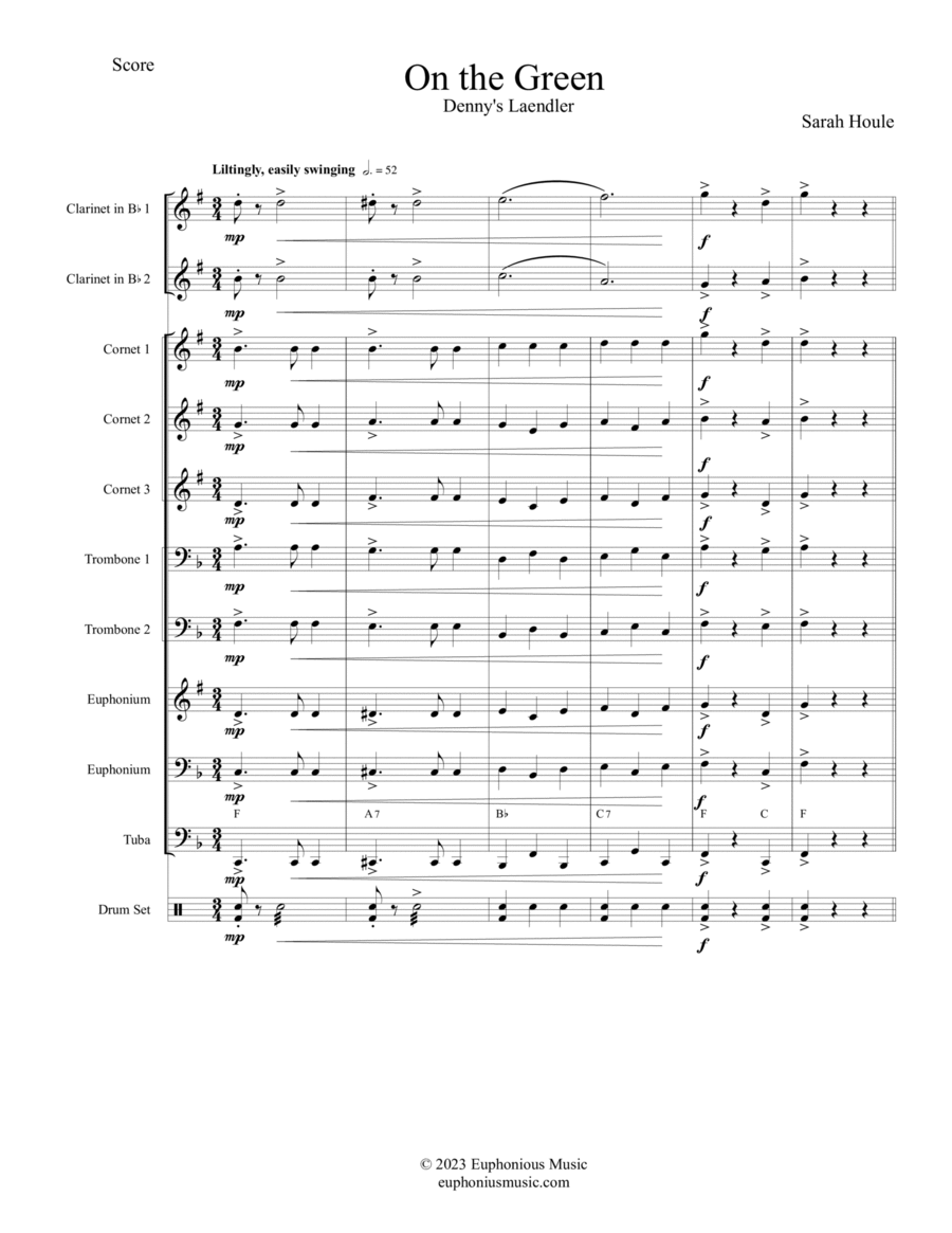 Clarinet,Drums,Euphonium,Tenor Trombone,Trumpet,Tuba - Level 3 - Digital Download SKU: A0.1423876 Composed by Sarah Houle. Classical,Contest,Festival,Multicultural,Standards,Traditional,World. 22 pages. SARAH L HOULE #1005102. Published by SARAH L HOULE (A0.1423876). On the Green - Denny's Laendler for Circus Band (2 Clarinets, 3 Trumpets, 2 Trombones, Euphonium BC and TC, Tuba, and Drums) by Sarah Houle, 2023/2024.Imagine a pleasant day on the green: perfect weather, blue skies with puffy white clouds, rolling along easily from one hole to the next in a little canopied golf cart. Lush green dotted with stately old oaks and surrounded by a beautiful state park is the scenery for this idyllic little laendler style piece. Characteristic of the heavy German influence of the area of inspiration, this piece has that old-time music feel as it lilts through each section. For a little interest, some of the phrases feature extensions, which diverge from the typical old-time music format of 8 measures. Fancy ornamentation accentuates some of the passages, creating slightly more robust moments.This version is for 10-piece circus band, which is a whittled down concert band that features mostly brass and clarinets.Enjoy On the Green - Denny's Laendler for Circus Band!