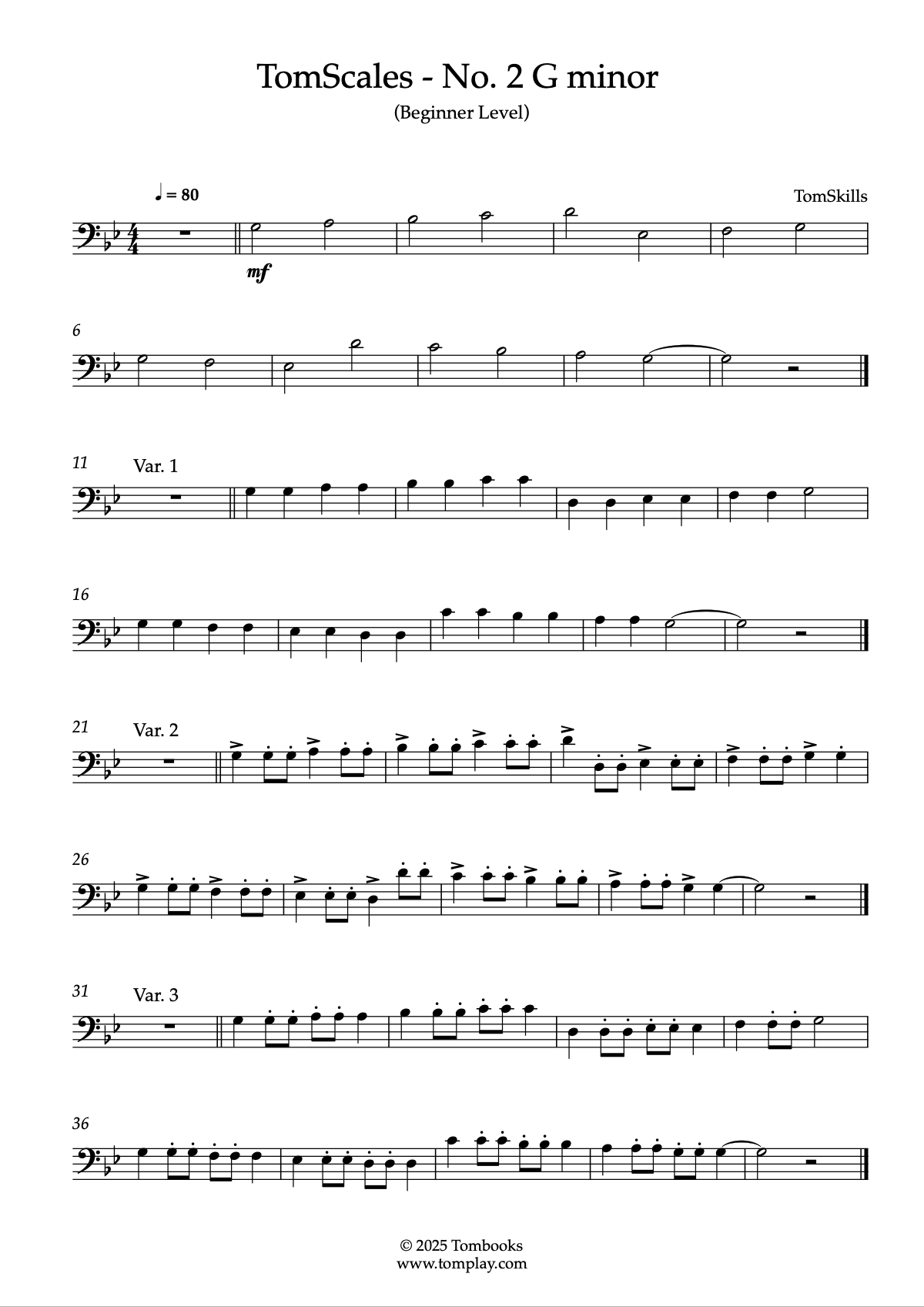 Téléchargez la partition Trombone TomScales - N° 2 Sol mineur (niveau débutant) de TomSkil…