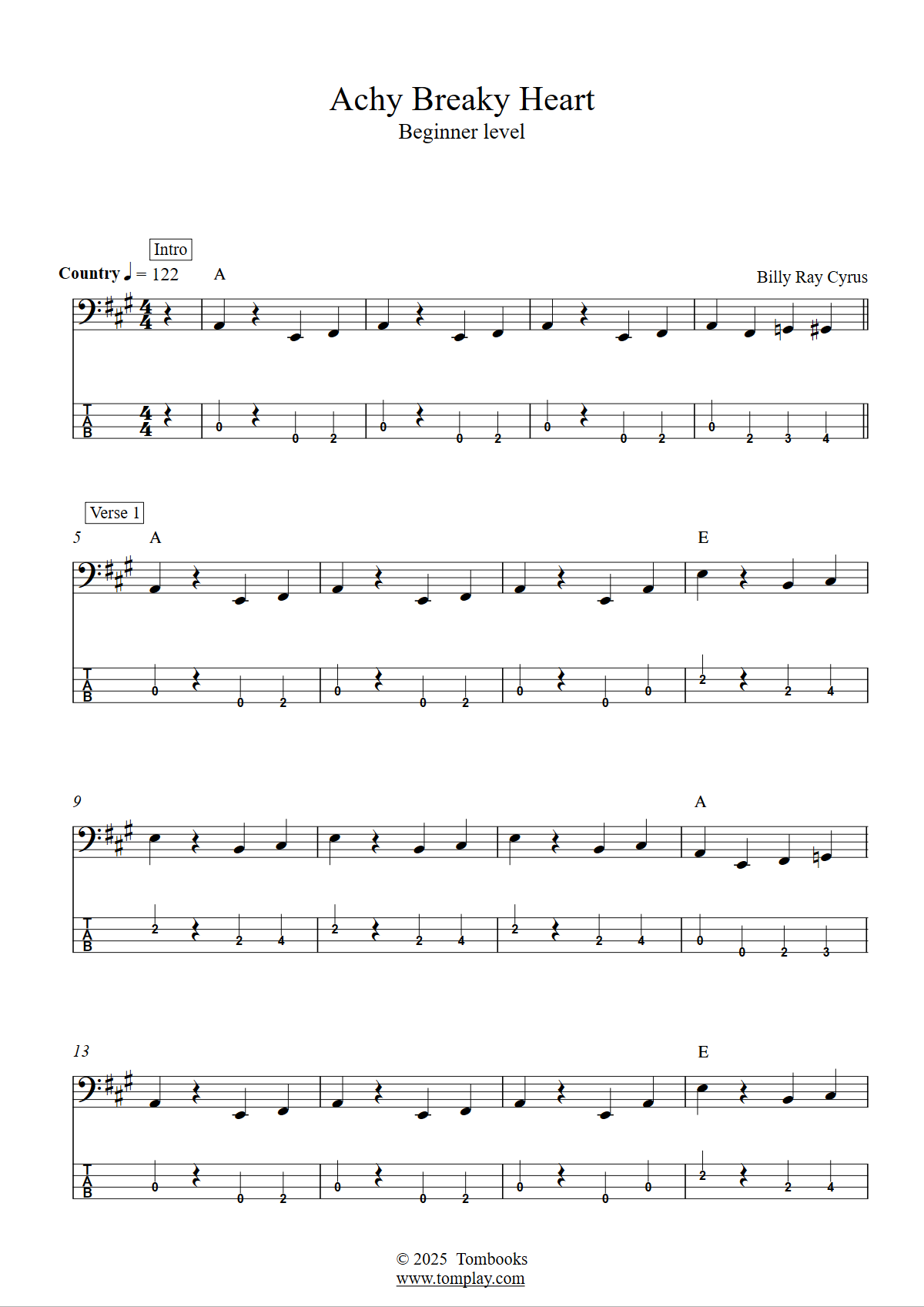 Téléchargez la tablature et la partition Basse Achy Breaky Heart (niveau débutant) de Bill…