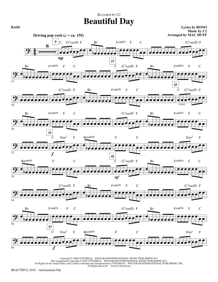 By U2. By Bono and The Edge. Arranged by Mark A. Brymer. For Bass. Rhythm. Concert; Festival; Inspirational; Pop. Individual instrument part. 2 pages. Duration 2:47. Published by Hal Leonard - Digital Sheet Music