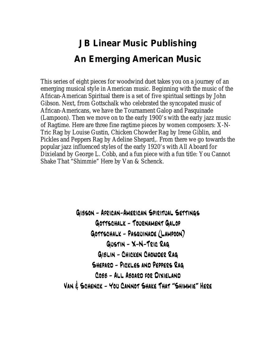 By Gottschalk, Gustin, Shepard, Giblin, Cobb. Arranged by John Gibson. For Clarinet, Bassoon. Jazz, Romantic Period, 20th Century. Intermediate. JB Linear #D0106. Published by JB Linear