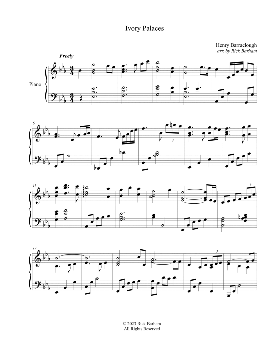 Guitar,Piano,Vocal,Voice - Level 3 - Digital Download SKU: A0.1359454 Composed by Henry Barraclough. Arranged by Leonora Hardy. Christian,Easter,Lent,Religious,Sacred. Score. 3 pages. Leonora Hardy #943915. Published by Leonora Hardy (A0.1359454). This lovely vintage hymn is an easily learned arrangement for the pianist who wants to have a more flowing style of music to accompany group singing or use as a piano or vocal solo. The melody is retained, as well as the traditional timing to help singers even if a song leader is not present. It is also suitable for church preludes, offertories or communion and particularly during Lent. It can also be used to accompany a soloist or C instruments such as violin, cello, flute or oboe. Lyrics of two of the verses are included as well as chords for guitar. Intermediate level. leonorahardy@gmail.com.