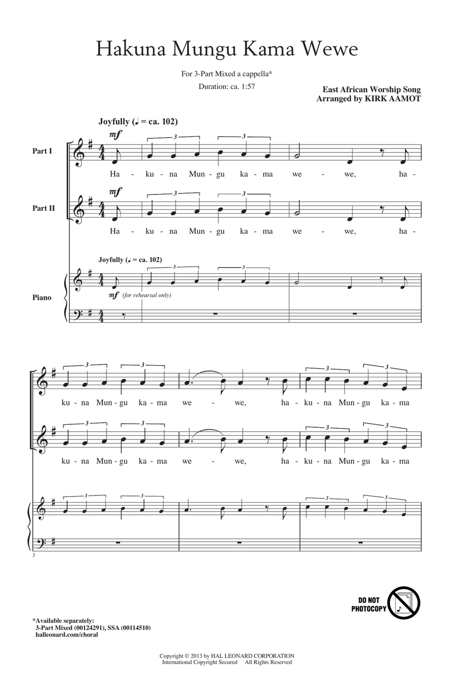 Kirk Aamot: Hakuna Mungu Kama Wewe sheet music to print instantly for choir (3-Part Mixed)