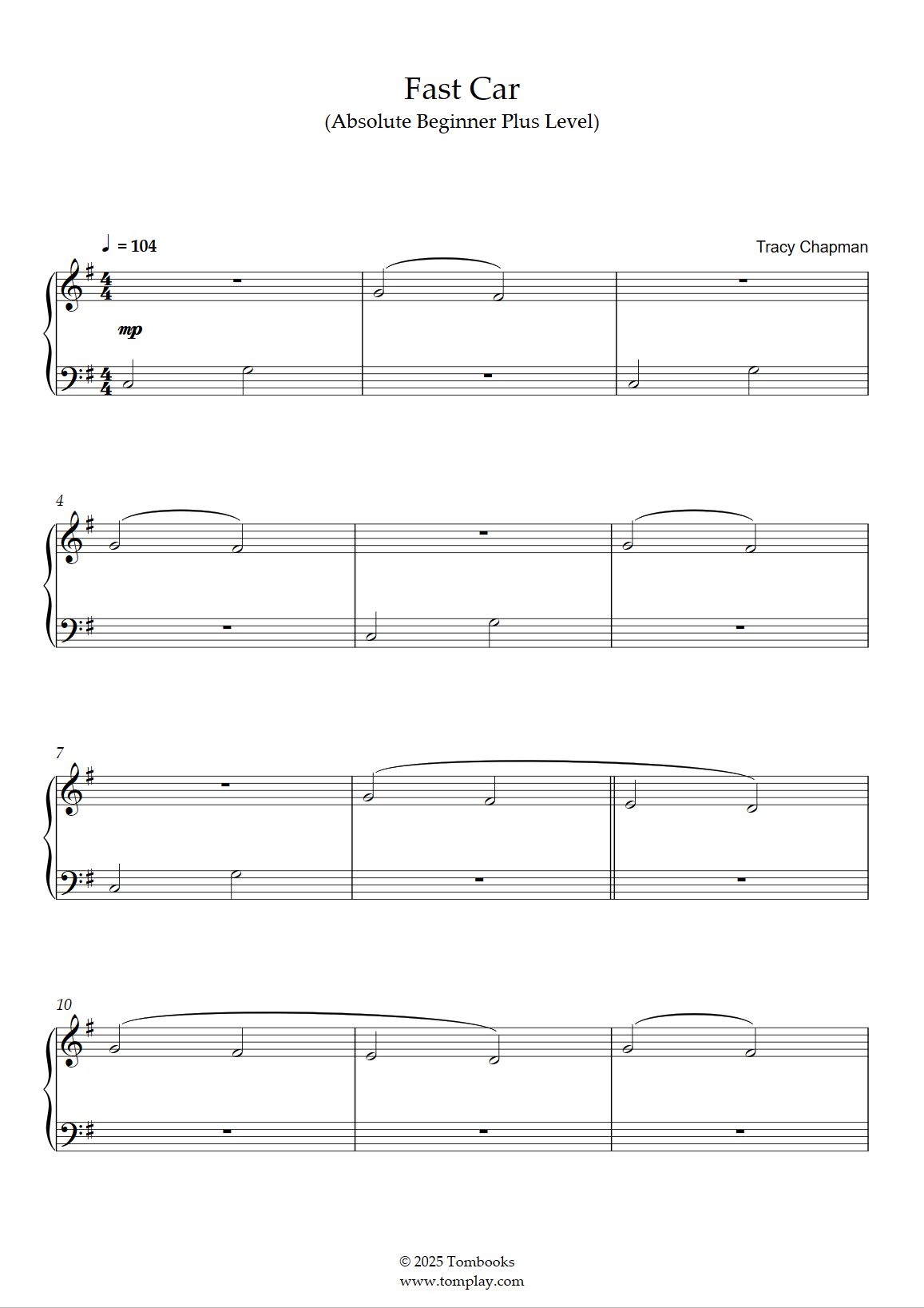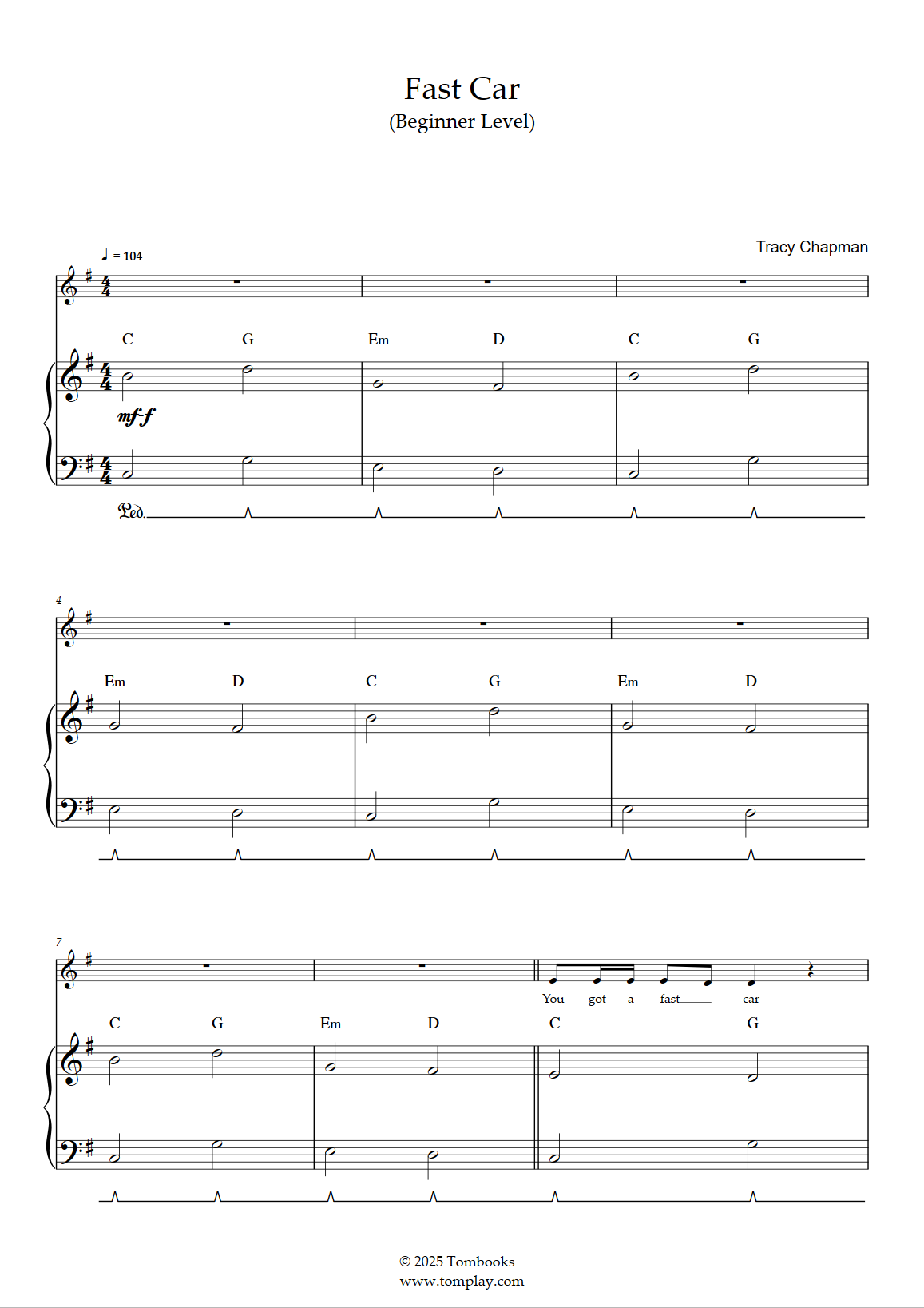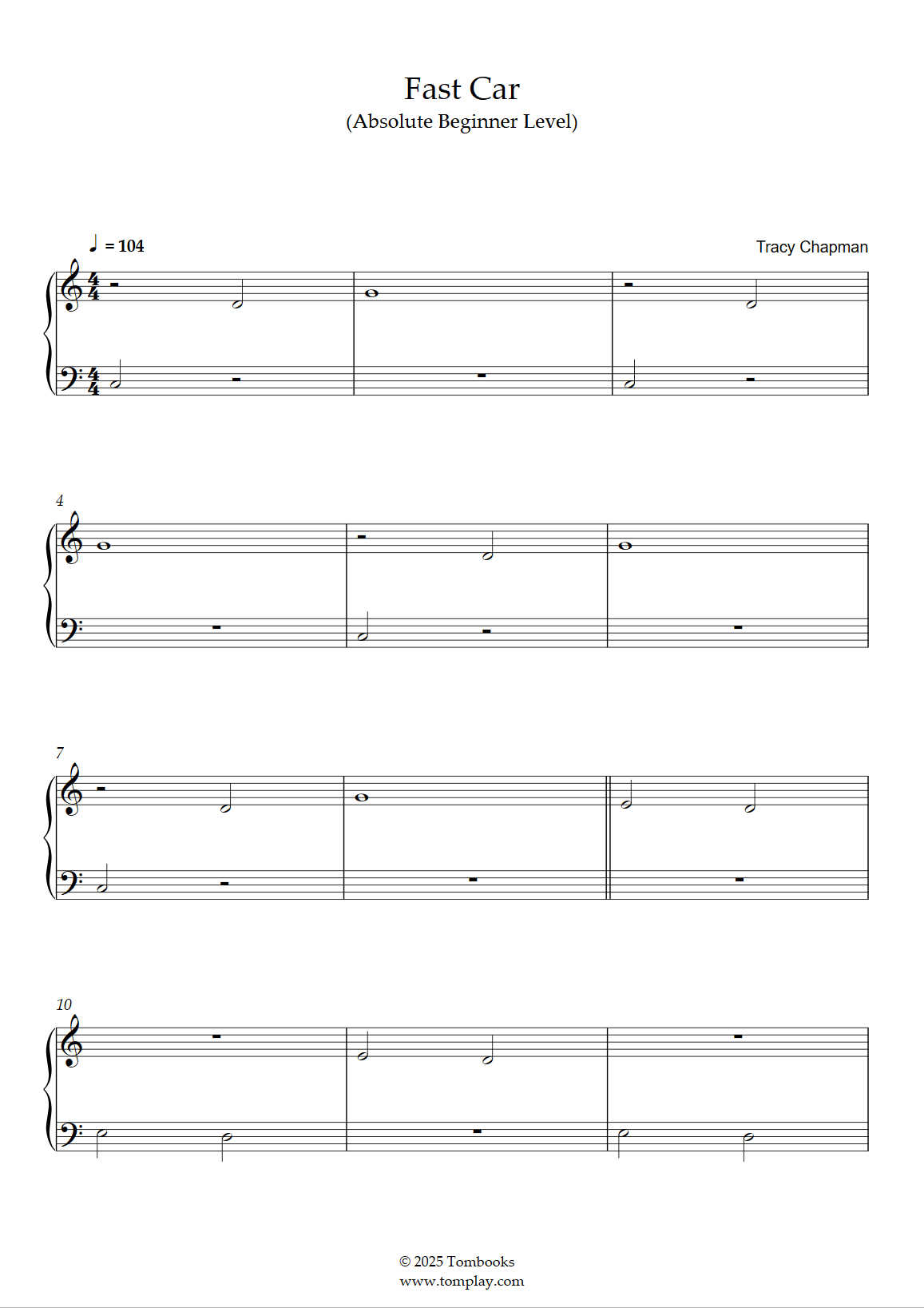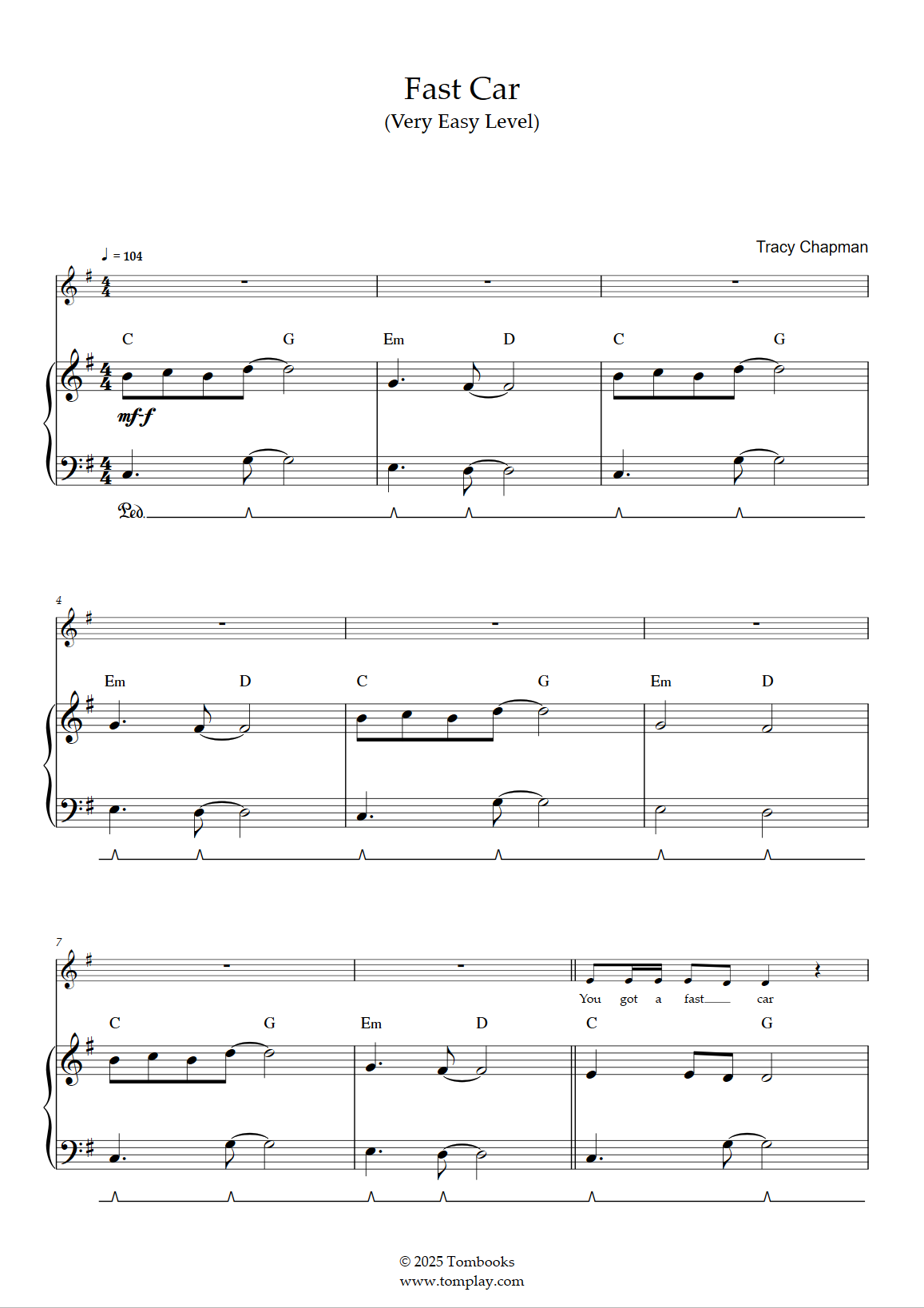Téléchargez la partition Piano Fast Car (niveau très facile, piano solo) de Tracy Chapman.…