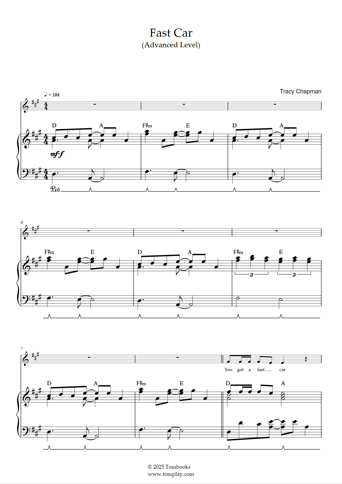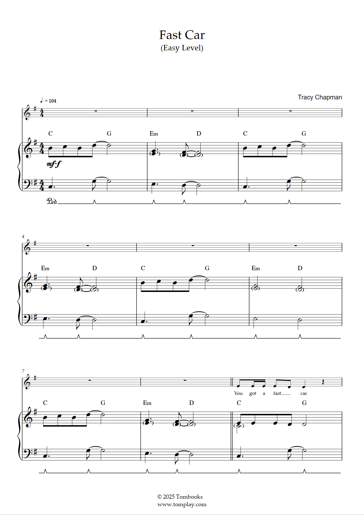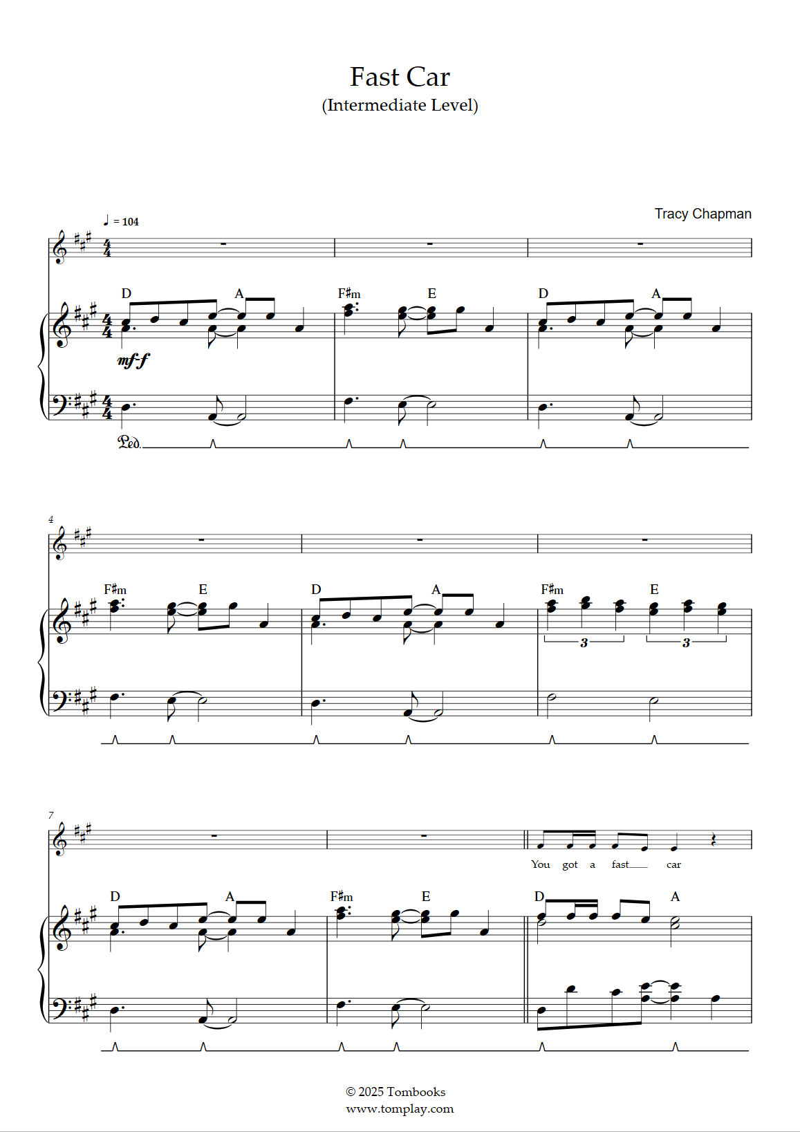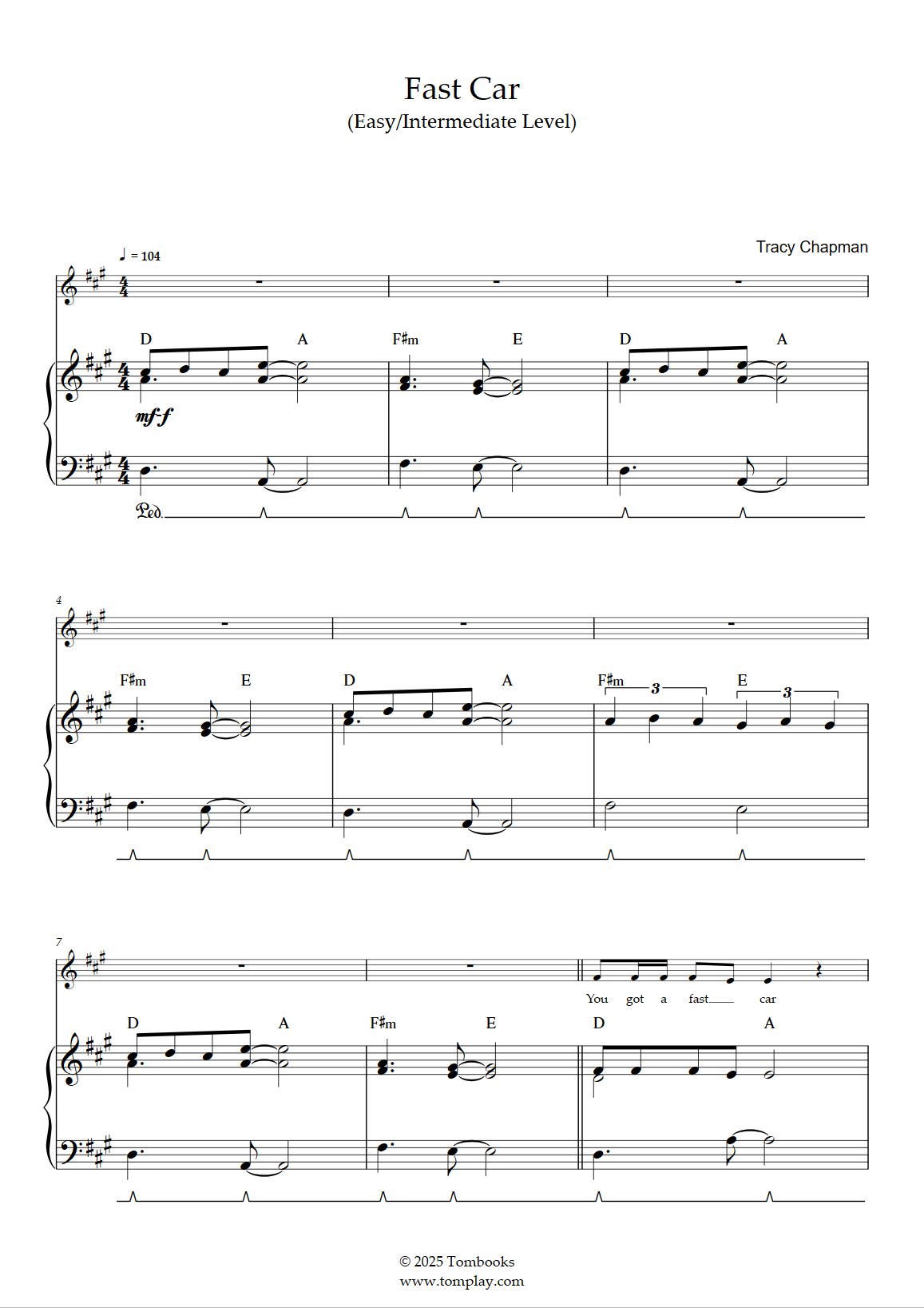 Téléchargez la partition Piano Fast Car (niveau intermédiaire, piano solo) de Tracy Chapma…