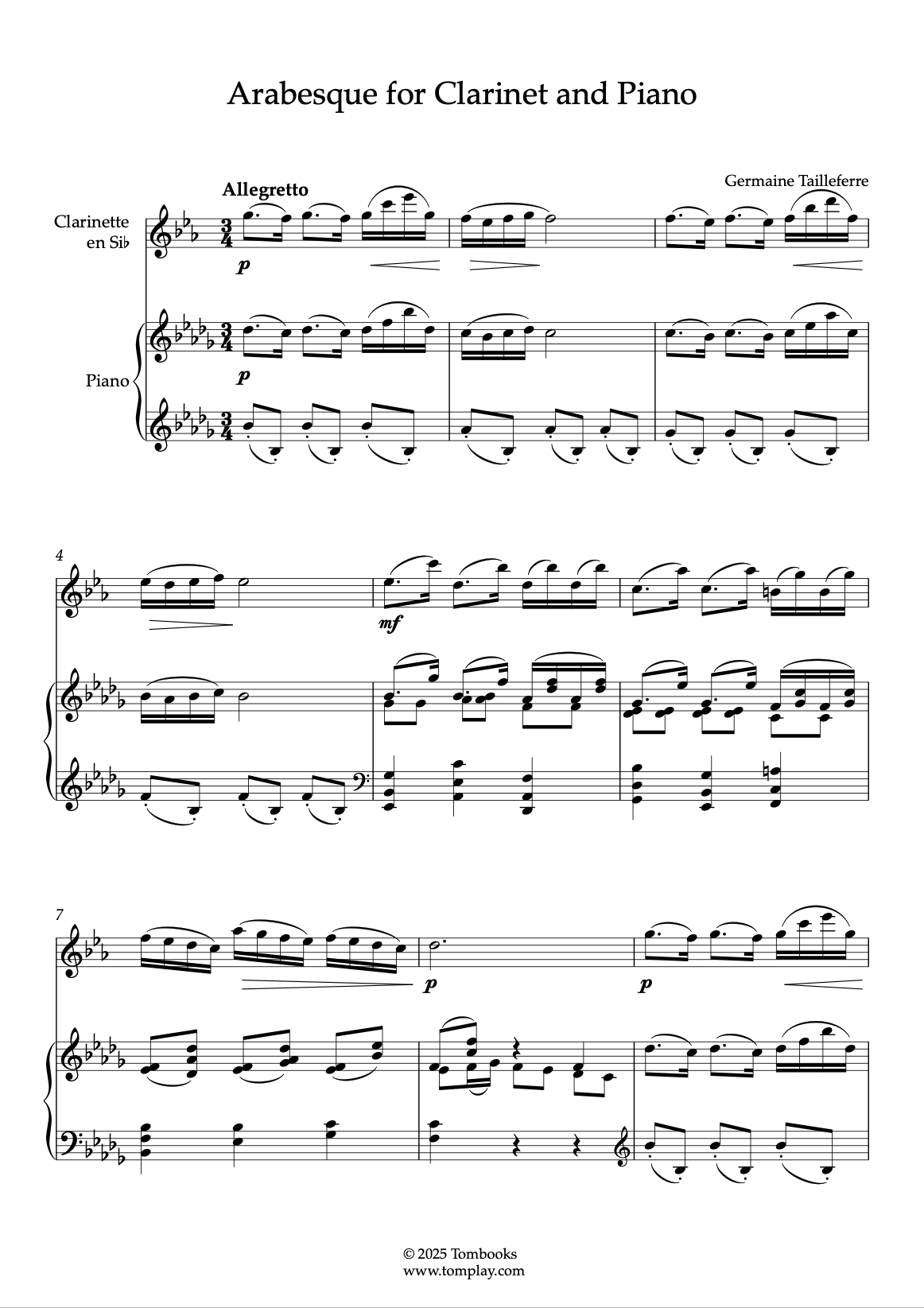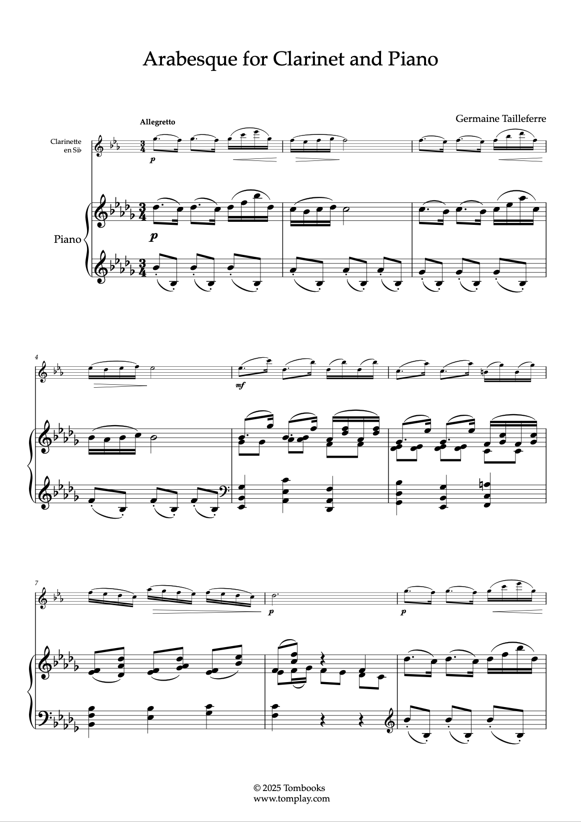 Téléchargez la partition Piano Arabesque pour clarinette et piano de Germaine Tailleferre.…