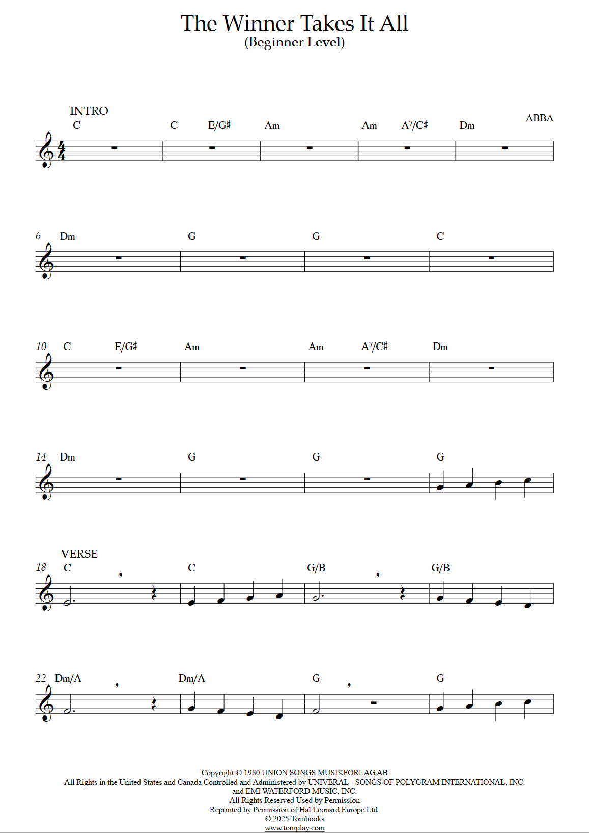ABBA : Mamma Mia! - The Winner Takes It All (niveau débutant, sax alto)
