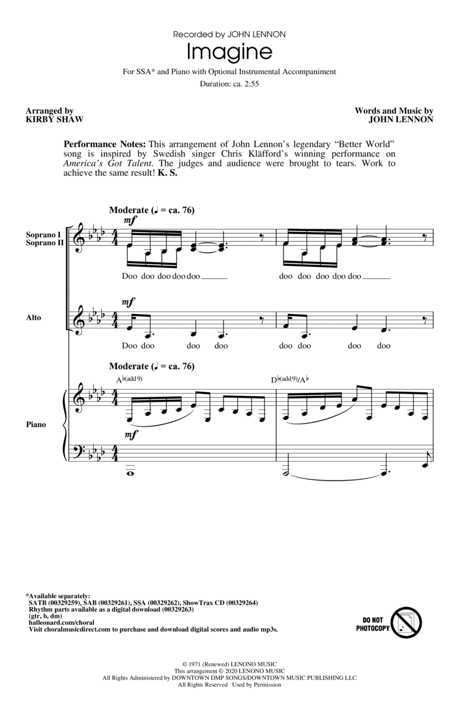 Choir, Voice, SSA, 3-Part - Digital Download By John Lennon. Arranged by Kirby Shaw. This edition: scorch. Pop,Rock,Standards. Octavo. 9 pages. Duration 7375. Hal Leonard - Digital #393120. Published by Hal Leonard - Digital