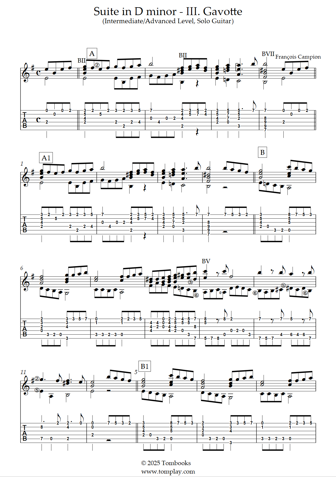 Campion François : Suite en ré mineur - III. Gavotte (niveau intermédiaire/difficile, guitare seule)