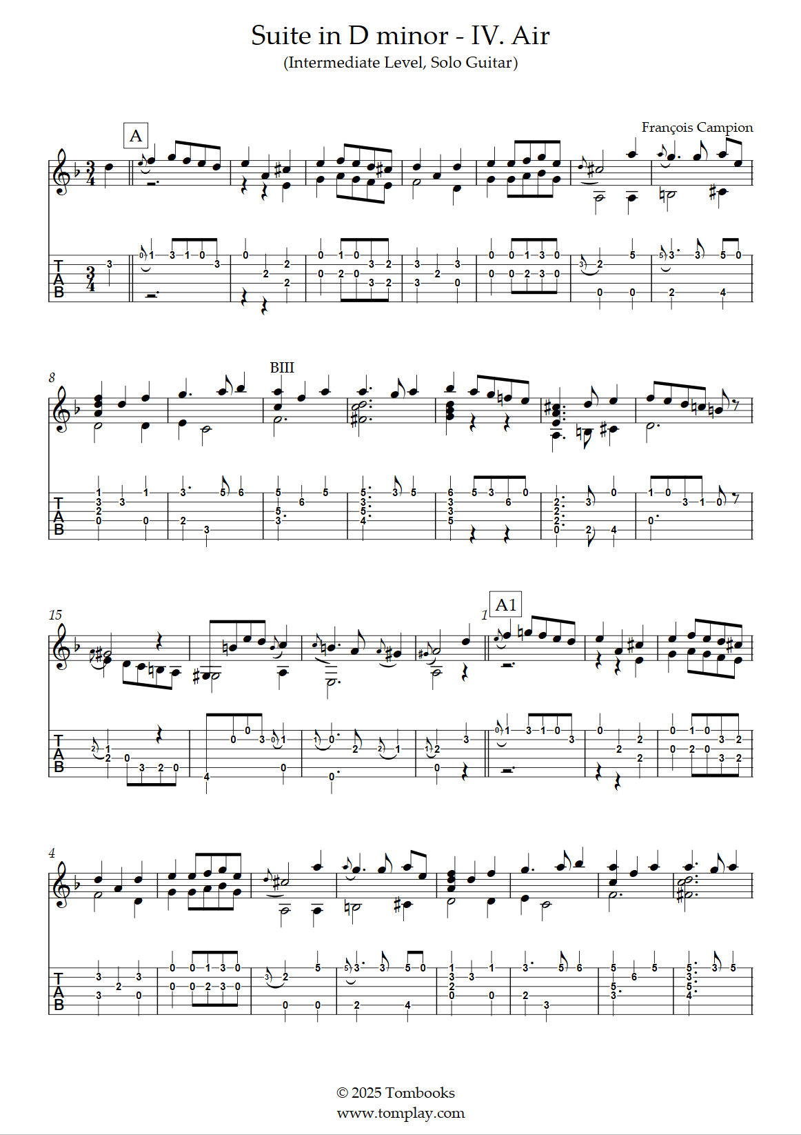 Campion François : Suite en ré mineur - IV. Air (niveau intermédiaire, guitare seule)