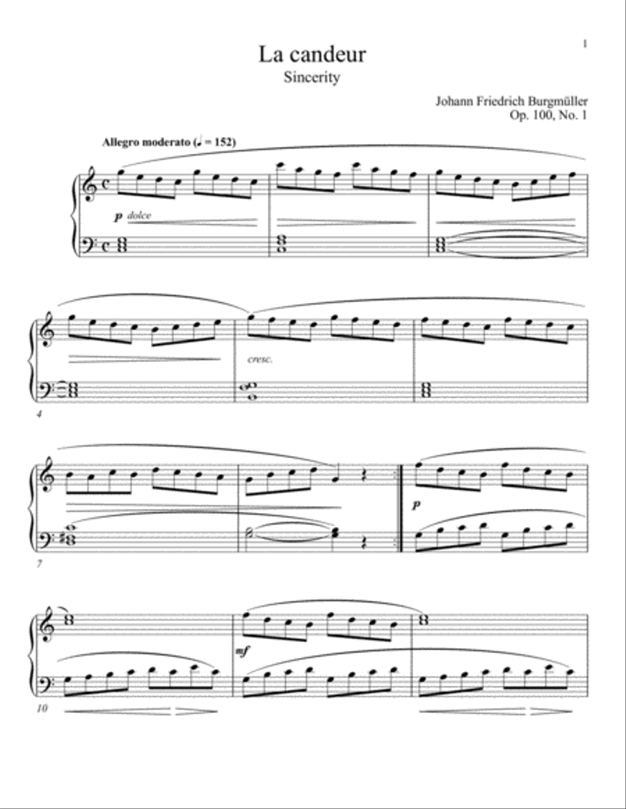 Piano,Tenor Saxophone - Level 1 - Digital Download SKU: A0.947902 Composed by Johann Friedrich Burgmuller. Arranged by Doniell Cushman. Classical,Instructional,Romantic Period,Standards. Score and part. 6 pages. Doniell C Cushman #3210517. Published by Doniell C Cushman (A0.947902). Based off of Burgmüller's original piano piece La Candeur (French for honesty), this arrangement is true to the original including articulations, dynamic shading, and general tempo. This piece is perfect for players at an beginning through intermediate level. Showcases scale motion and long legato phrases. Sounds wonderful with the timbre different than the piano original. Quick tempo, eighth note passages, and dynamic shading are all important mechanisms in this piece.Original arranged material, all rights reserved.