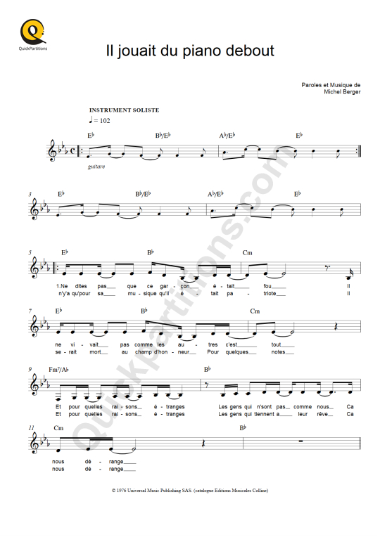 Concert Band - Level 3 - Digital Download SKU: A0.1427860 Composed by Michele Berger. Arranged by Malcolm J. Fineas. Pop,Singer/Songwriter. 31 pages. Malcolm J. Fineas #1008602. Published by Malcolm J. Fineas (A0.1427860). Arrangement of the famous song Il jouait du piano debout by Michel Berger.Arranged for concert bandInstrumentation :Flute in CClarinet 1,2 in BbBass Clarinet in BbAlto Saxophone in EbTenor Saxophone in BbBaritone Saxophone in EbHorn in FTrumpet 1,2 in BbTrombone in CEuphonium in CTuba in CTimpaniGlockenspielDrum SetPercussion.
