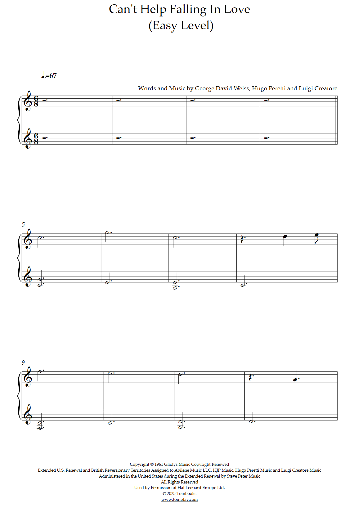 Elvis Presley : Can't Help Falling In Love (niveau facile)