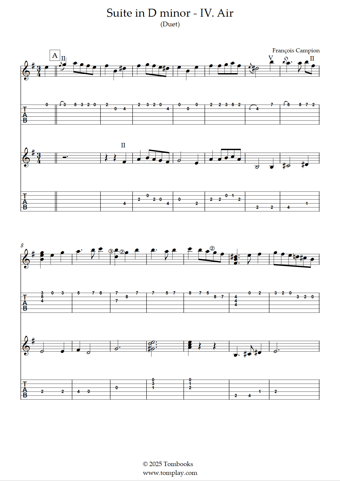 Téléchargez la tablature et la partition Guitare Suite en ré mineur - IV. Air (Duo) de Cam…