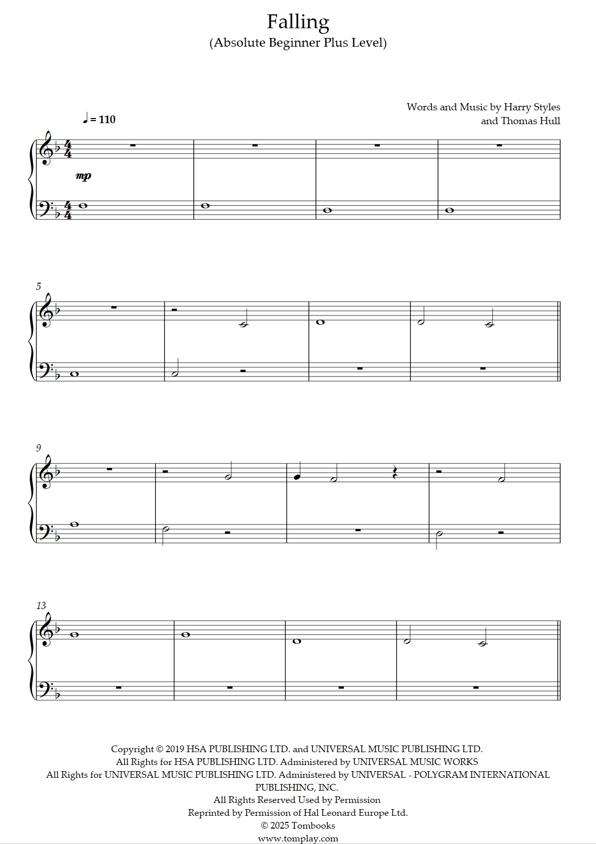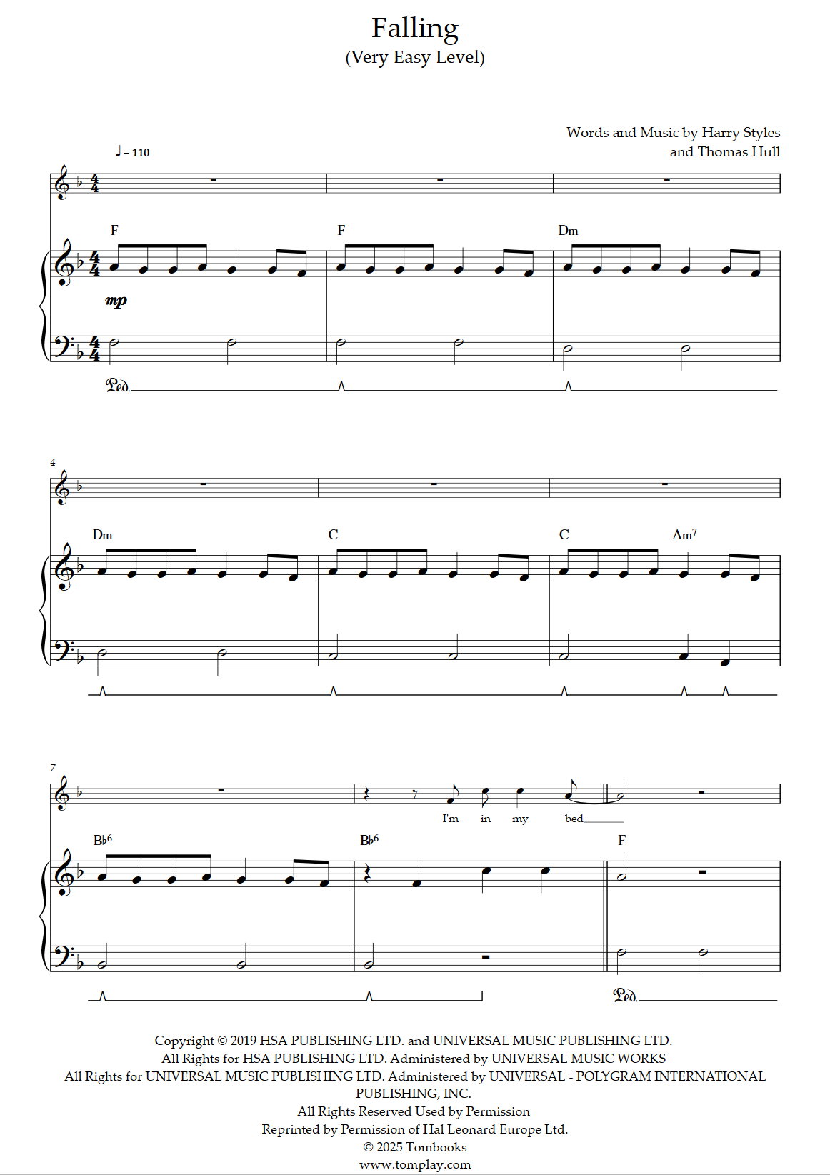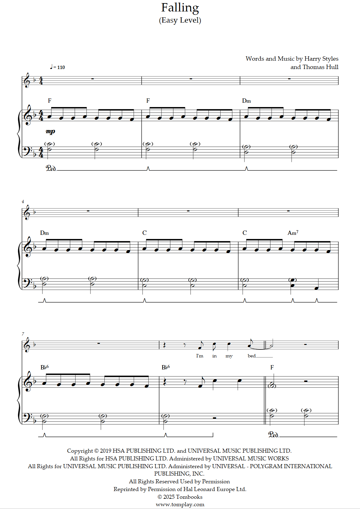 Téléchargez la partition Piano Falling (niveau facile, piano solo) de Harry Styles. Partit…