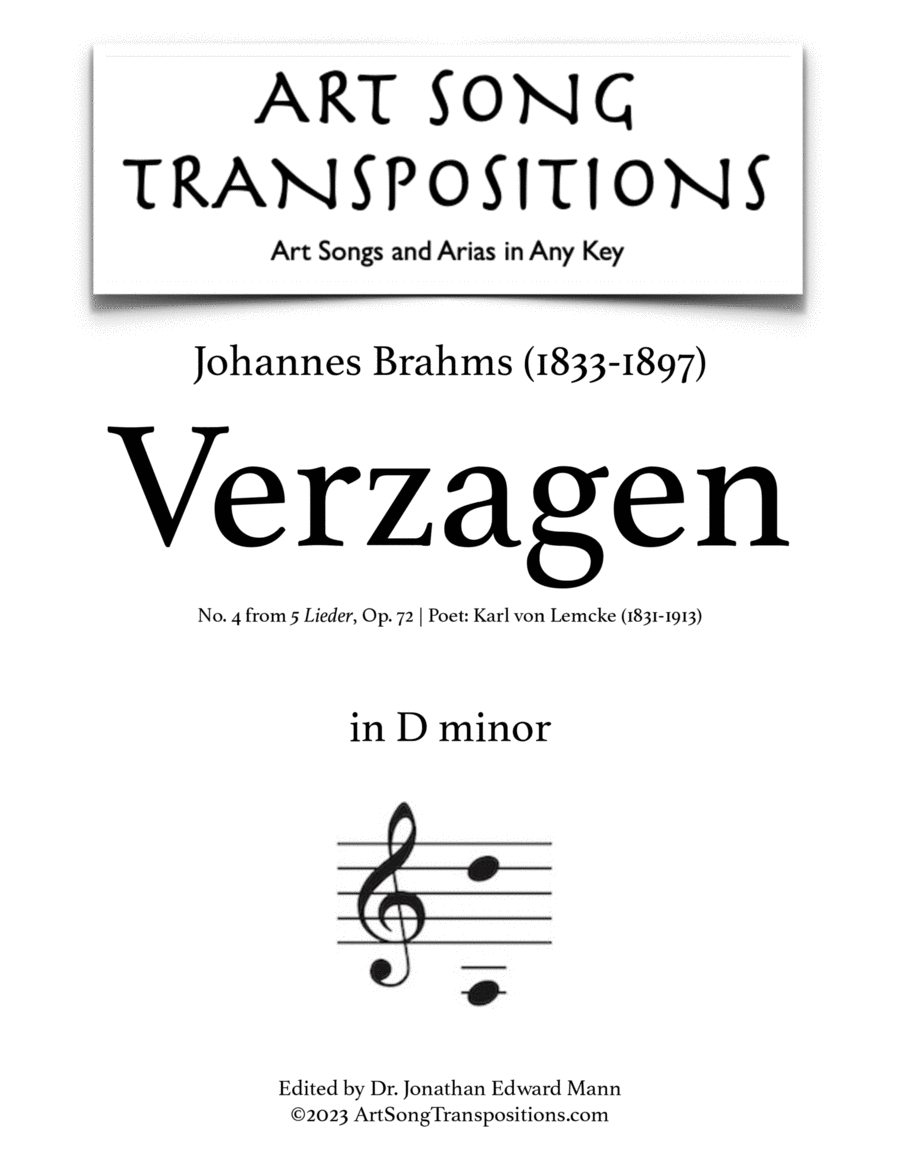 Piano,Vocal,Voice - Digital Download SKU: A0.538009 Composed by Johannes Brahms. Arranged by ArtSongTranspositions.com. Romantic Period. Score. 5 pages. AST Publications, LLC #3570333. Published by AST Publications, LLC (A0.538009). ⇨ PAY $0.00 with INSTITUTIONAL MEMBERSHIP✓ 10,000+ art songs and Baroque aria PDFs✓ Transpose sheet music to any key✓ Free for faculty, students, staff, and employees✓ Campus-wide access via IP authentication✓ Off-campus access via EZproxy or SAML