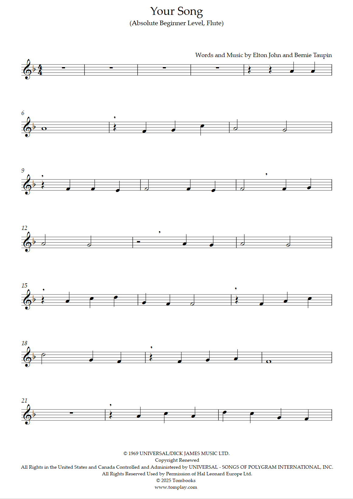 Téléchargez la partition Flûte Your Song (niveau débutant absolu) de Elton John. Partition…