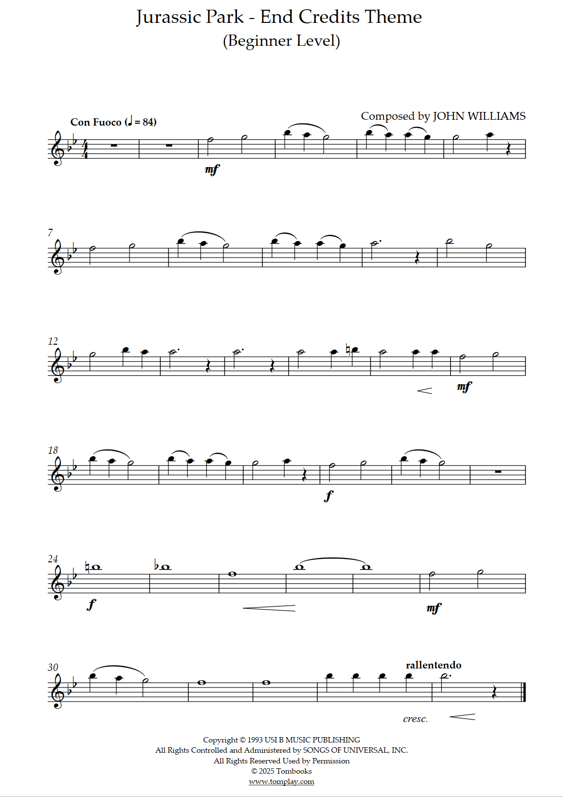 John Williams : Jurassic Park - Thème End Credits (niveau débutant)