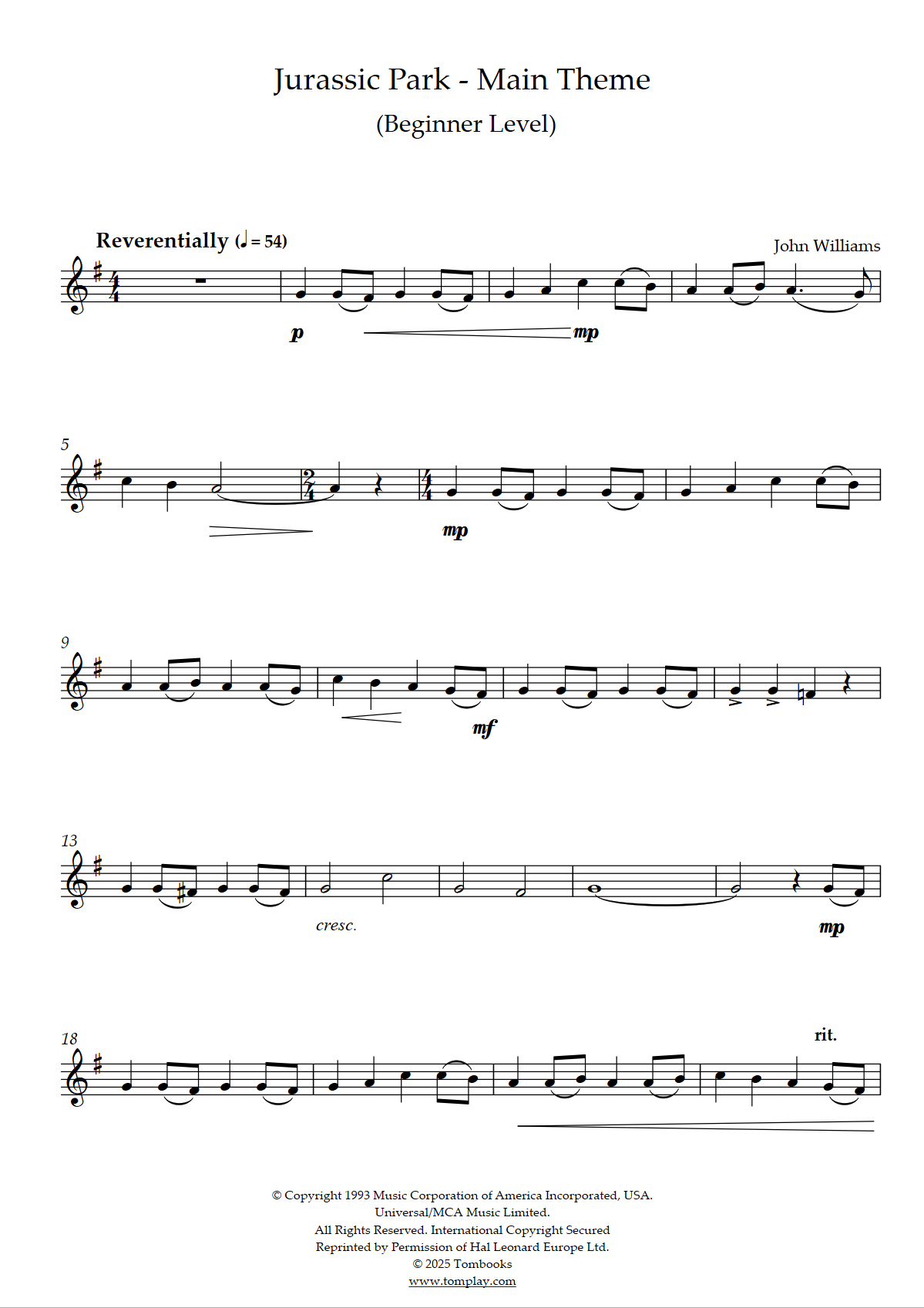 John Williams : Jurassic Park - Thème End Credits (niveau débutant)